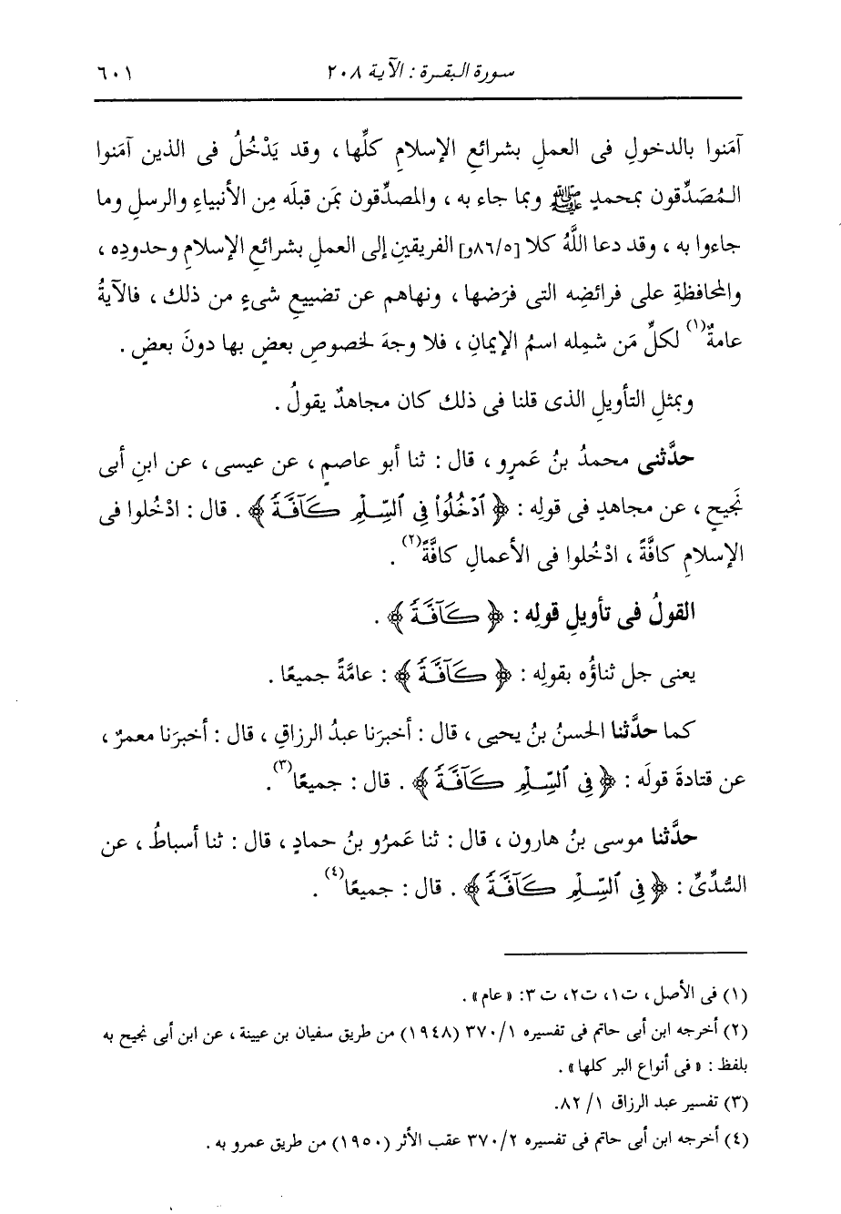 حَدَّثَنِي مُحَمَّدُ بْنُ عَمْرٍو، قَالَ: ثنا أَبُو عَاصِمٍ، عَنْ عِيسَى، عَنِ ابْنِ أَبِي نَجِيحٍ، عَنْ مُجَاهِدٍ، فِي قَوْلِ اللَّهِ عَزَّ وَجَلَّ: " {§ادْخُلُوا فِي السِّلْمِ كَافَّةً} [البقرة: 208] قَالَ: ادْخُلُوا فِي الْإِسْلَامِ كَافَّةً، ادْخُلُوا فِي الْأَعْمَالِ كَافَّةً "