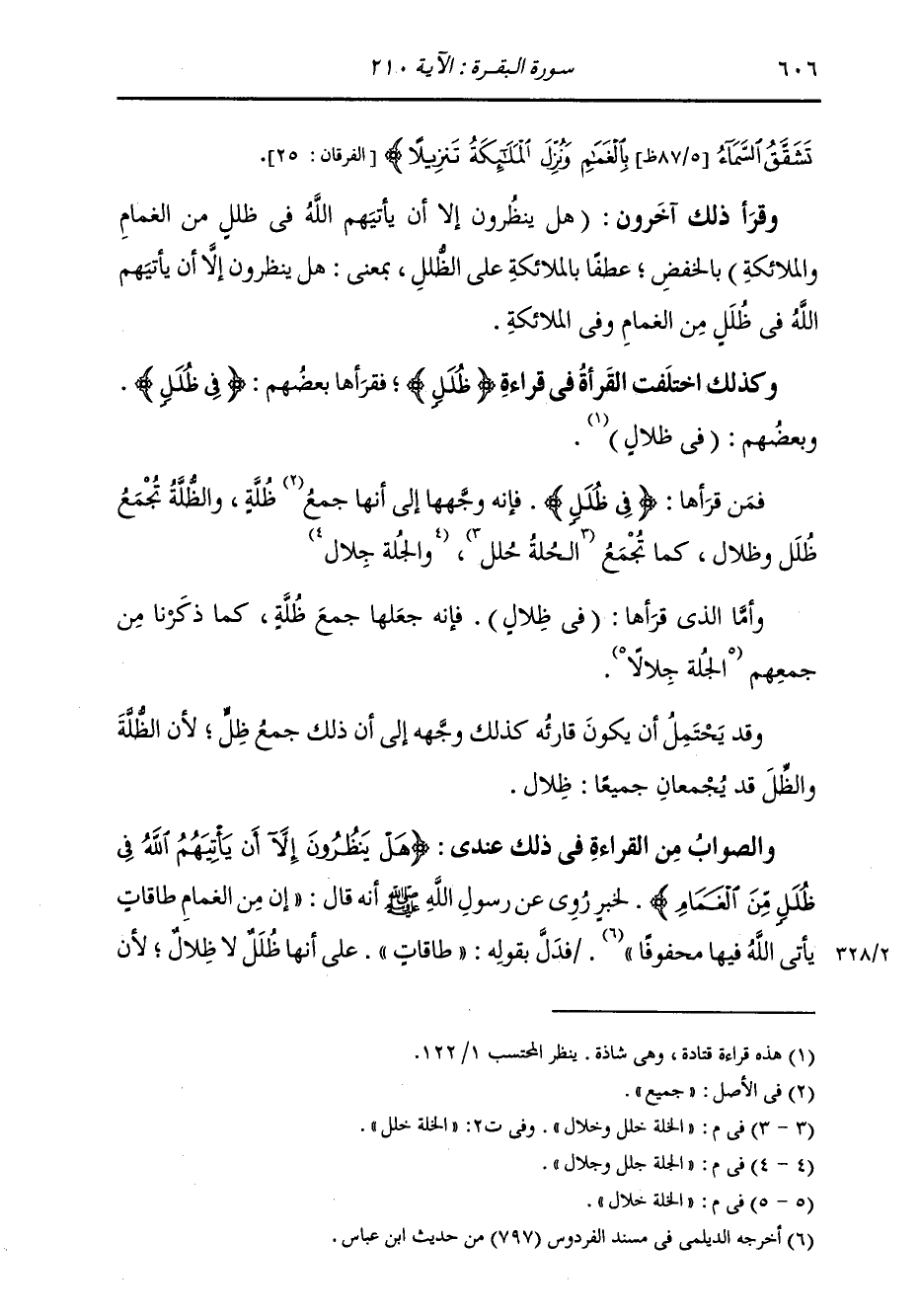 تَشَقَّقُ السَّمَاءُ بِالْغَمَامِ وَنُزِّلَ الْمَلَائِكَةُ تَنْزِيلًا} [الفرقان: 25] " وَقَرَأَ ذَلِكَ آخَرُونَ: «هَلْ يَنْظُرُونَ إِلَّا أَنْ يَأْتِيَهُمُ اللَّهُ فِي ظُلَلٍ مِنَ الْغَمَامِ وَالْمَلَائِكَةِ» بِالْخَفْضِ عَطْفًا بِالْمَلَائِكَةِ عَلَى الظُّلَلِ؛ بِمَعْنَى: هَلْ يَنْظُرُونَ إِلَّا أَنْ يَأْتِيَهُمُ اللَّهُ فِي ظُلَلٍ مِنَ الْغَمَامِ وَفِي الْمَلَائِكَةِ. وَكَذَلِكَ اخْتَلَفَتِ الْقُرَّاءُ فِي قِرَاءَةِ «ظُلَلٍ» ، فَقَرَأَهَا بَعْضُهُمْ: «فِي ظُلَلٍ» ، وَبَعْضُهُمْ: «فِي ظِلَالٍ» . فَمَنْ قَرَأَهَا «فِي ظُلَلٍ» ، فَإِنَّهُ وَجَّهَهَا إِلَى أَنَّهَا جَمْعُ ظُلَّةٍ، وَالظُّلَّةُ تُجْمَعُ ظُلَلٌ وَظِلَالٌ، كَمَا تُجْمَعُ الْخُلَّةَ خُلَلٌ وَخِلَالٌ، وَالْجُلَّةُ جُلَلٌ وَجِلَالٌ. وَأَمَّا الَّذِي قَرَأَهَا فِي ظِلَالٍ فَإِنَّهُ جَعَلَهَا جَمْعَ ظُلَّةٍ، كَمَا ذَكَرْنَا مِنْ جَمْعِهِمُ الْخُلَّةَ خِلَالٌ. وَقَدْ يُحْتَمَلُ أَنْ يَكُونَ قَارِئُهُ كَذَلِكَ وَجَّهَهُ إِلَى أَنَّ ذَلِكَ جَمْعُ ظِلٍّ، لِأَنَّ الظُّلَّةَ وَالظِّلَّ قَدْ يُجْمَعَانِ جَمِيعًا ظِلَالًا. وَالصَّوَابُ مِنَ الْقِرَاءَةِ فِي ذَلِكَ عِنْدِي {هَلْ يَنْظُرُونَ إِلَّا أَنْ يَأْتِيَهُمُ اللَّهُ فِي ظُلَلٍ مِنَ الْغَمَامِ} [البقرة: 210] لِخَبَرٍ رُوِيَ عَنْ رَسُولِ اللَّهِ صَلَّى اللهُ عَلَيْهِ وَسَلَّمَ أَنَّهُ قَالَ: «إِنَّ مِنَ الْغَمَامِ طَاقَاتٌ يَأْتِي اللَّهُ فِيهَا مَحْفُوفًا» فَدَلَّ بِقَوْلِهِ طَاقَاتٍ عَلَى أَنَّهَا ظُلَلٌ لَا ظِلَالٌ، لِأَنَّ