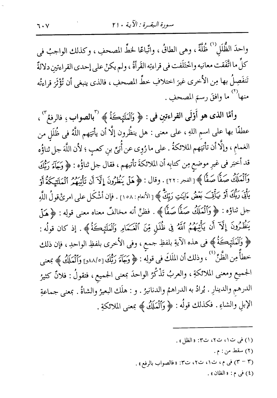 وَاحِدَ الظُّلَلِ ظُلَّةٌ، وَهِيَ الطَّاقُ. وَاتِّبَاعًا لِخَطِّ الْمُصْحَفِ. وَكَذَلِكَ الْوَاجِبُ فِي كُلِّ مَا اتَّفَقَتْ مَعَانِيهِ وَاخْتَلَفَتْ فِي قِرَاءَتِهِ الْقُرَّاءُ وَلَمْ يَكُنْ عَلَى إِحْدَى الْقِرَاءَتَيْنِ دَلَالَةٌ تَنْفَصِلُ بِهَا مِنَ الْأُخْرَى غَيْرَ اخْتِلَافِ خَطِّ الْمُصْحَفِ، فَالَّذِي يَنْبَغِي أَنْ تُؤْثَرَ قِرَاءَتُهُ مِنْهَا مَا وَافَقَ رَسْمَ الْمُصْحَفِ. وَأَمَّا الَّذِي هُوَ أَوْلَى الْقِرَاءَتَيْنِ فِي: {وَالْمَلَائِكَةُ} [البقرة: 210] فَالصَّوَابُ بِالرَّفْعِ عَطْفًا بِهَا عَلَى اسْمِ اللَّهِ تَبَارَكَ وَتَعَالَى عَلَى مَعْنَى: هَلْ يَنْظُرُونَ إِلَّا أَنْ يَأْتِيَهُمُ اللَّهُ فِي ظُلَلٍ مِنَ الْغَمَامِ، وَإِلَّا أَنْ تَأْتِيَهُمُ الْمَلَائِكَةُ؛ عَلَى مَا رُوِيَ عَنْ أُبَيِّ بْنِ كَعْبٍ، لِأَنَّ اللَّهَ جَلَّ ثَنَاؤُهُ قَدْ أَخْبَرَ فِي غَيْرِ مَوْضِعٍ مِنْ كِتَابِهِ أَنَّ الْمَلَائِكَةَ تَأْتِيَهُمْ، فَقَالَ جَلَّ ثَنَاؤُهُ: {وَجَاءَ رَبُّكَ وَالْمَلَكُ صَفًّا صَفًّا} [الفجر: 22] وَقَالَ: {هَلْ يَنْظُرُونَ إِلَّا أَنْ تَأْتِيَهُمُ الْمَلَائِكَةُ أَوْ يَأْتِيَ رَبُّكَ أَوْ يَأْتِيَ بَعْضُ آيَاتِ رَبِّكَ} [الأنعام: 158] فَإِنْ أَشْكَلَ عَلَى امْرِئٍ قَوْلُ اللَّهِ جَلَّ ثَنَاؤُهُ: {وَالْمَلَكُ صَفًّا صَفًّا} [الفجر: 22] فَظَنَّ أَنَّهُ مُخَالِفٌ مَعْنَاهُ مَعْنَى قَوْلِهِ {هَلْ يَنْظُرُونَ إِلَّا أَنْ يَأْتِيَهُمُ اللَّهُ فِي ظُلَلٍ مِنَ الْغَمَامِ وَالْمَلَائِكَةُ} [البقرة: 210] إِذْ كَانَ قَوْلُهُ «وَالْمَلَائِكَةُ» فِي هَذِهِ الْآيَةِ بِلَفْظِ جَمْعٍ، وَفِي الْأُخْرَى بِلَفْظِ الْوَاحِدِ. فَإِنَّ ذَلِكَ خَطَأٌ مِنَ الظَّانِّ، وَذَلِكَ أَنَّ الْمَلَكَ فِي قَوْلِهِ: {وَجَاءَ رَبُّكَ وَالْمَلَكُ} [الفجر: 22] بِمَعْنَى الْجَمِيعِ، وَمَعْنَى الْمَلَائِكَةِ، وَالْعَرَبُ تَذْكُرُ الْوَاحِدَ بِمَعْنَى الْجَمِيعِ، فَتَقُولُ: فُلَانٌ كَثِيرُ الدِّرْهَمِ، وَالدِّينَارِ، يُرَادُ بِهِ الدَّرَاهِمَ وَالدَّنَانِيرَ، وَهَلَكَ الْبَعِيرُ وَالشَّاةُ بِمَعْنَى جَمَاعَةِ الْإِبِلِ وَالشَّاءِ، فَكَذَلِكَ قَوْلُهُ: {وَالْمَلَكُ} [الفجر: 22] بِمَعْنَى الْمَلَائِكَةِ.