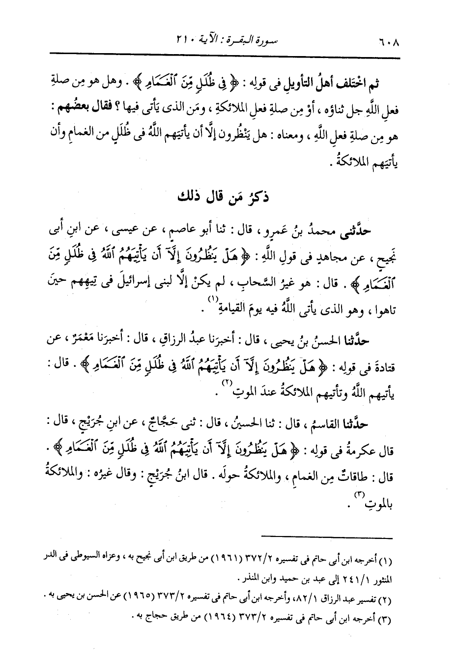 حَدَّثَنَا الْقَاسِمُ، قَالَ: ثنا الْحُسَيْنُ، قَالَ: ثني حَجَّاجٌ، عَنِ ابْنِ جُرَيْجٍ، قَالَ: قَالَ عِكْرِمَةُ فِي قَوْلِهِ: " {§هَلْ يَنْظُرُونَ إِلَّا أَنْ يَأْتِيَهُمُ اللَّهُ فِي ظُلَلٍ مِنَ الْغَمَامٍ} [البقرة: 210] قَالَ: طَاقَاتٌ مِنَ الْغَمَامِ وَالْمَلَائِكَةِ حَوْلَهُ " قَالَ ابْنُ جُرَيْجٍ وَقَالَ غَيْرُهُ: «وَالْمَلَائِكَةُ بِالْمَوْتِ»