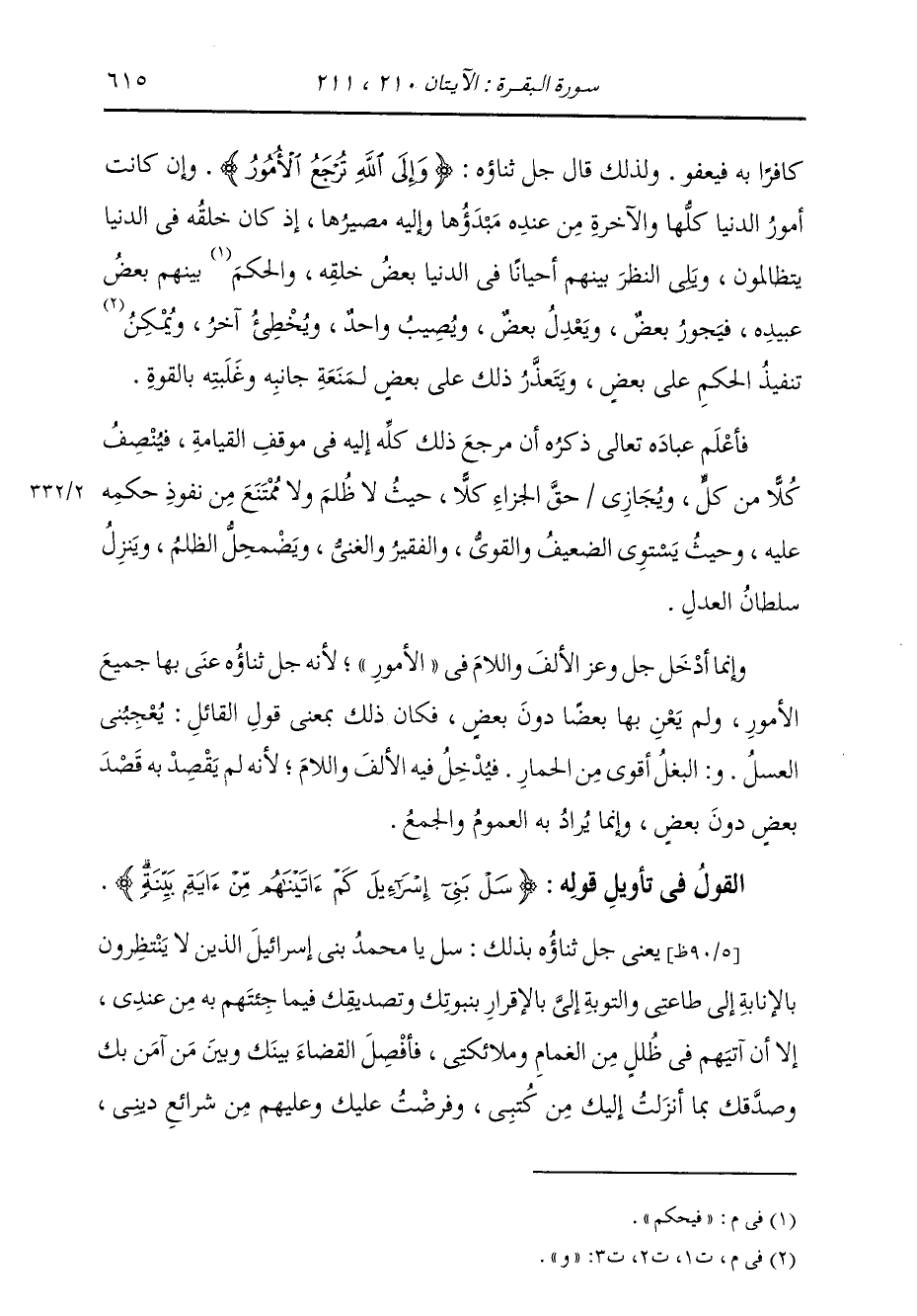 كَافِرًا فَيَعْفُو؛ وَلِذَلِكَ قَالَ جَلَّ ثَنَاؤُهُ: {وَإِلَى اللَّهِ تُرْجَعُ الْأُمُورُ} [البقرة: 210] وَإِنْ كَانَتْ أُمُورُ الدُّنْيَا كُلُّهَا، وَالْآخِرَةِ مِنْ عِنْدِهِ مَبْدَؤُهَا وَإِلَيْهِ مَصِيرُهَا، إِذْ كَانَ خَلْقُهُ فِي الدُّنْيَا يَتَظَالَمُونَ، وَيُلِي النَّظَرَ بَيْنَهُمْ أَحْيَانًا فِي الدُّنْيَا بَعْضَ خَلْقِهِ، فَيُحَكِّمُ بَيْنَهُمْ بَعْضَ عَبِيدِهِ، فَيَجُورُ بَعْضٌ، وَيَعْدِلُ بَعْضٌ، وَيُصِيبُ وَاحِدٌ، وَيُخْطِئُ وَاحِدٌ، وَيُمَكَّنُ مِنْ تَنْفِيذِ الْحُكْمِ عَلَى بَعْضٍ، وَيَتَعَذَّرُ ذَلِكَ عَلَى بَعْضٍ لِمَنْعَةِ جَانِبِهِ وَغَلَبَتِهِ بِالْقُوَّةِ. فَأَعْلَمَ عِبَادَهُ تَعَالَى ذِكْرُهُ أَنَّ مَرْجِعَ جَمِيعِ ذَلِكَ إِلَيْهِ فِي مَوْقِفِ الْقِيَامَةِ، فَيُنْصِفُ كُلًّا مِنْ كُلٍّ، وَيُجَازِي حَقَّ الْجَزَاءِ كُلًّا، حَيْثُ لَا ظُلْمَ وَلَا مُمْتَنِعٍ مِنْ نُفُوذِ حُكْمِهِ عَلَيْهِ، وَحَيْثُ يَسْتَوِي الضَّعِيفُ وَالْقَوِيُّ، وَالْفَقِيرُ، وَالْغَنِيُّ، وَيَضْمَحِلُّ الظُّلْمُ، وَيَنْزِلُ سُلْطَانُ الْعَدْلِ. وَإِنَّمَا أَدْخَلَ جَلَّ وَعَزَّ الْأَلِفَ وَاللَّامَ فِي الْأُمُورِ لِأَنَّهُ جَلَّ ثَنَاؤُهُ عَنَى بِهَا جَمِيعَ الْأُمُورِ، وَلَمْ يَعْنِ بِهَا بَعْضًا دُونَ بَعْضٍ، فَكَانَ ذَلِكَ بِمَعْنَى قَوْلِ الْقَائِلِ: يُعْجِبُنِي الْعَسَلُ، وَالْبَغْلُ أَقْوَى مِنَ الْحِمَارِ، فَيُدْخِلُ فِيهِ الْأَلِفَ وَاللَّامَ، لِأَنَّهُ لَمْ يَقْصِدْ بِهِ قَصْدَ بَعْضٍ دُونَ بَعْضٍ، إِنَّمَا يُرَادُ بِهِ الْعُمُومُ وَالْجَمْعُ