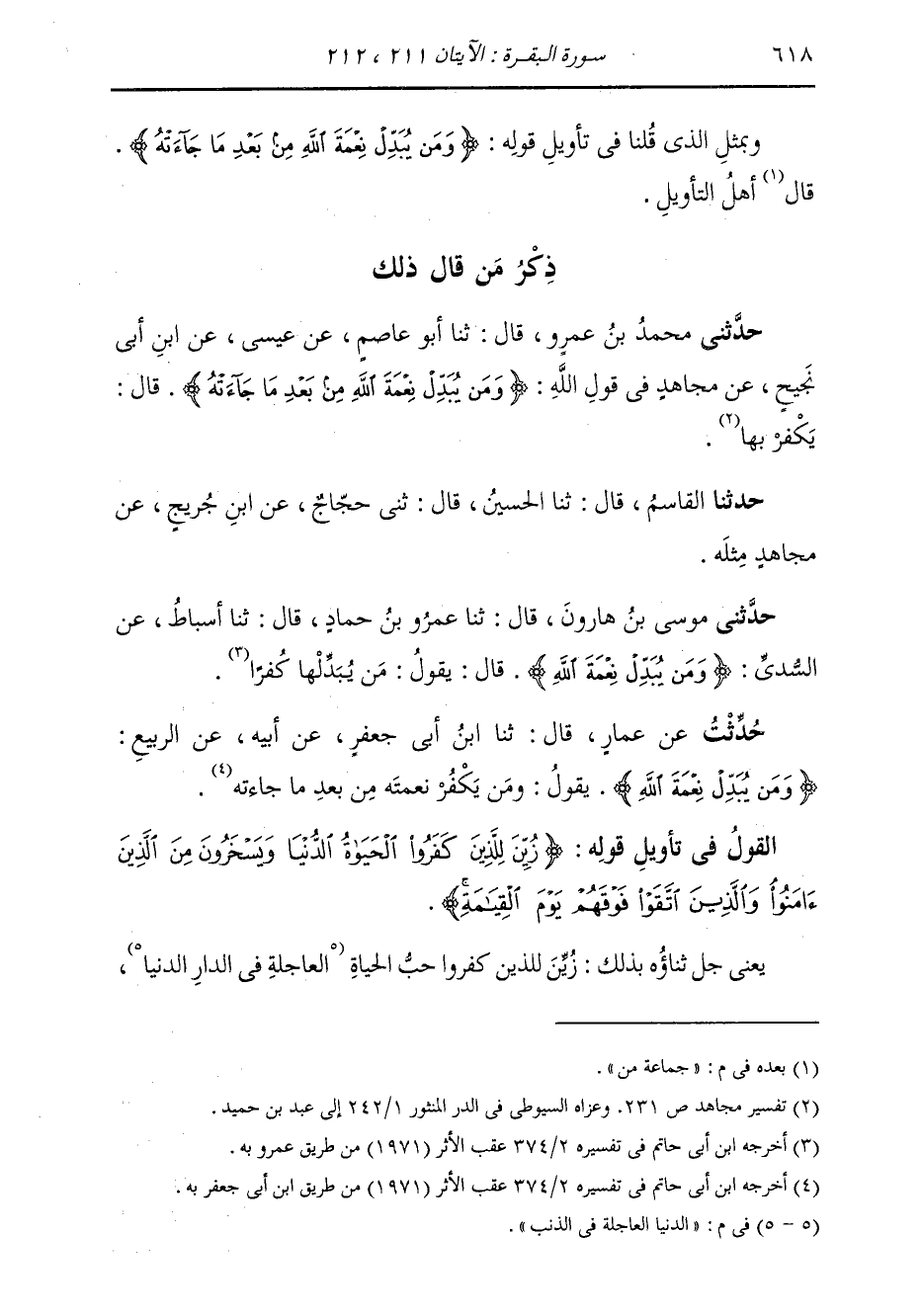 ذِكْرُ مَنْ قَالَ ذَلِكَ حَدَّثَنِي مُحَمَّدُ بْنُ عَمْرٍو، قَالَ: ثنا أَبُو عَاصِمٍ، قَالَ: ثنا عِيسَى، عَنِ ابْنِ أَبِي نَجِيحٍ، عَنْ مُجَاهِدٍ، فِي قَوْلِهِ: " {§وَمَنْ يُبَدِّلْ نِعْمَةَ اللَّهِ مِنْ بَعْدِ مَا جَاءَتْهُ} [البقرة: 211] قَالَ: يَكْفُرُ بِهَا " حَدَّثَنَا الْقَاسِمُ، قَالَ: ثنا الْحُسَيْنُ، قَالَ: ثني حَجَّاجٌ، عَنِ ابْنِ جُرَيْجٍ، عَنْ مُجَاهِدٍ، مِثْلَهُ