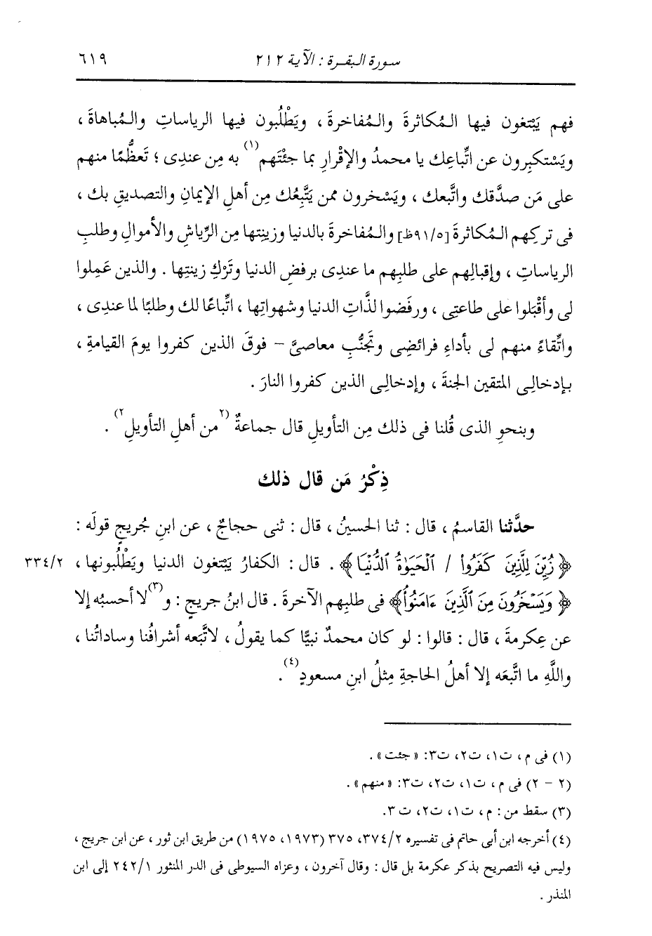 ذِكْرُ مَنْ قَالَ ذَلِكَ حَدَّثَنَا الْقَاسِمُ، قَالَ: ثنا الْحُسَيْنُ، قَالَ: ثني حَجَّاجٌ، عَنِ ابْنِ جُرَيْجٍ، قَوْلَهُ: " {§زُيِّنَ لِلَّذِينَ كَفَرُوا الْحَيَاةُ الدُّنْيَا} [البقرة: 212] قَالَ: «الْكُفَّارُ يَبْتَغُونَ الدُّنْيَا وَيَطْلُبُونَهَا، وَيَسْخَرُونَ مِنَ الَّذِينَ آمَنُوا فِي طَلَبِهِمُ الْآخِرَةَ» , قَالَ ابْنُ جُرَيْجٍ: لَا أَحْسَبُهُ إِلَّا عَنْ عِكْرِمَةَ، قَالَ: قَالُوا: «لَوْ كَانَ مُحَمَّدٌ نَبِيًّا كَمَا يَقُولُ، لَاتَّبَعَهُ أَشْرَافُنَا، وَسَادَاتُنَا، وَاللَّهُ مَا اتَّبَعَهُ إِلَّا أَهْلُ الْحَاجَةِ مِثْلَ ابْنِ مَسْعُودٍ»