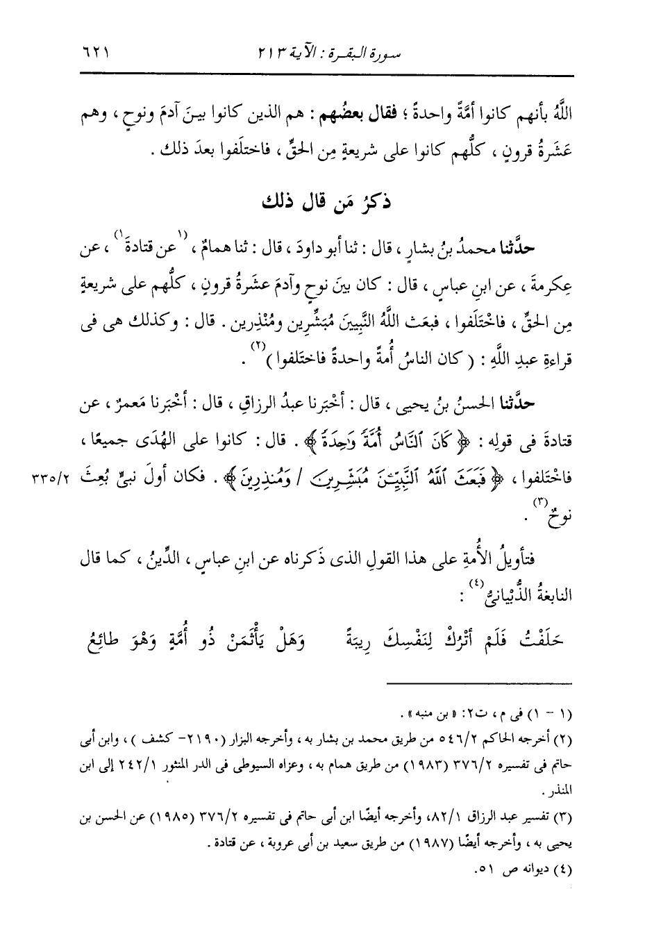 ذِكْرُ مَنْ قَالَ ذَلِكَ حَدَّثَنَا مُحَمَّدُ بْنُ بَشَّارٍ، قَالَ: ثنا أَبُو دَاوُدَ، قَالَ: ثنا هَمَّامُ بْنُ مُنَبِّهٍ، عَنْ عِكْرِمَةَ، عَنِ ابْنِ عَبَّاسٍ، قَالَ: " كَانَ بَيْنَ نُوحٍ، وَآدَمَ، عَشْرَةُ قُرُونٍ، كُلُّهُمْ عَلَى شَرِيعَةٍ مِنَ الْحَقِّ، فَاخْتَلَفُوا، {§فَبَعَثَ اللَّهُ النَّبِيِّينَ مُبَشِّرِينَ وَمُنْذِرِينَ} [البقرة: 213] ، قَالَ: وَكَذَلِكَ هِيَ فِي قِرَاءَةِ عَبْدِ اللَّهِ «كَانَ النَّاسُ أُمَّةً وَاحِدَةً فَاخْتَلَفُوا»