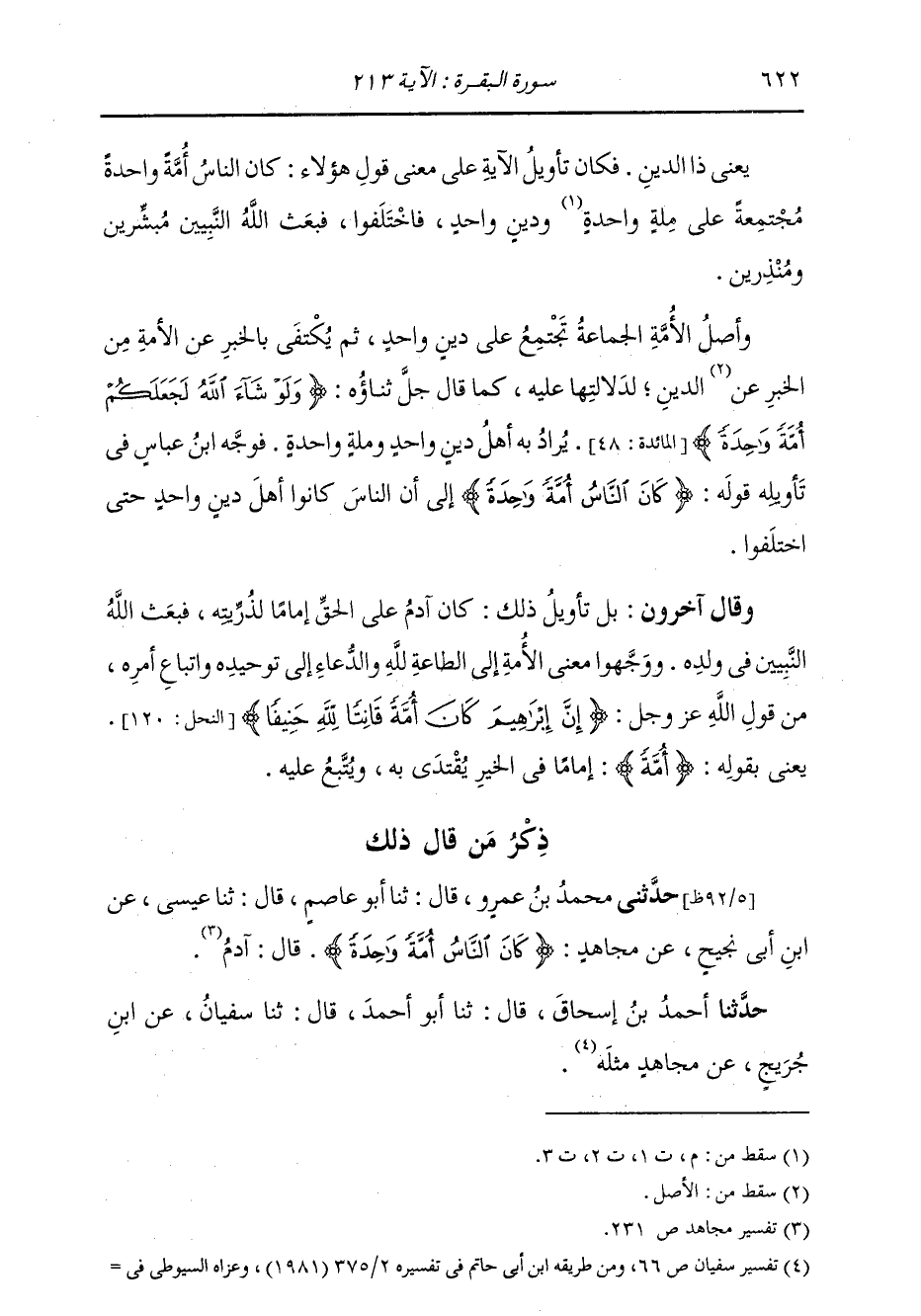 ذِكْرُ مَنْ قَالَ ذَلِكَ حَدَّثَنِي مُحَمَّدُ بْنُ عَمْرٍو، قَالَ: ثنا أَبُو عَاصِمٍ، قَالَ: ثنا عِيسَى، عَنِ ابْنِ أَبِي نَجِيحٍ، عَنْ مُجَاهِدٍ: " {§كَانَ النَّاسُ أُمَّةً وَاحِدَةً} [البقرة: 213] قَالَ: آدَمُ " حَدَّثَنَا أَحْمَدُ بْنُ إِسْحَاقَ، قَالَ: ثنا أَبُو أَحْمَدَ، قَالَ: ثنا سُفْيَانُ، عَنِ ابْنِ جُرَيْجٍ، عَنْ مُجَاهِدٍ مِثْلَهُ