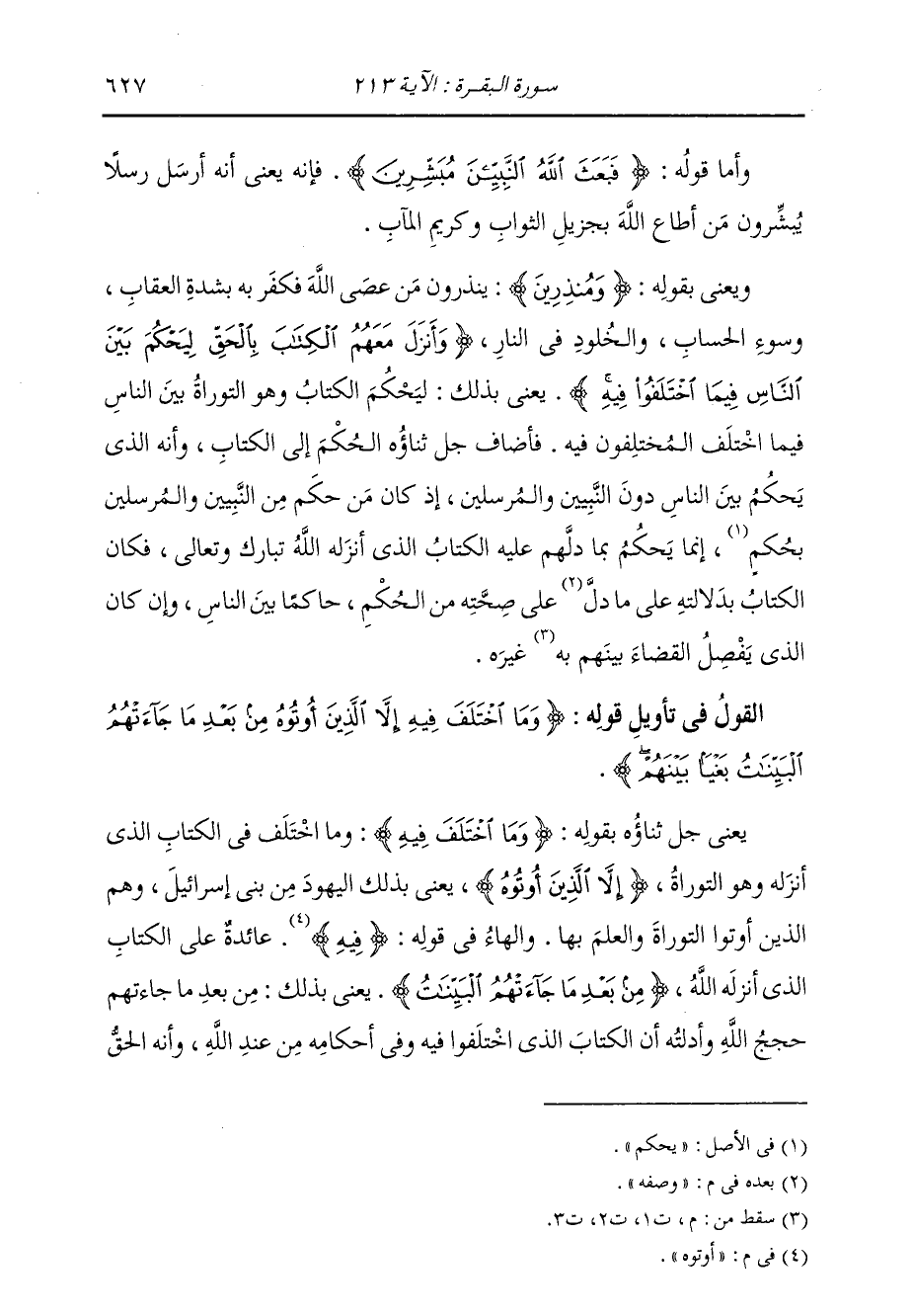 §وَأَمَّا قَوْلُهُ: {فَبَعَثَ اللَّهُ النَّبِيِّينَ مُبَشِّرِينَ وَمُنْذِرِينَ} [البقرة: 213] فَإِنَّهُ يَعْنِي أَنَّهُ أَرْسَلَ رُسُلًا يُبَشِّرُونَ مَنْ أَطَاعَ اللَّهَ بِجَزِيلِ الثَّوَابِ، وَكَرِيمِ الْمَآبِ؛ وَيَعْنِي بِقَوْلِهِ {وَمُنْذِرِينَ} [البقرة: 213] يُنْذِرُونَ مَنْ عَصَى اللَّهَ فَكَفَرَ بِهِ، بِشِدَّةِ الْعِقَابِ، وَسُوءِ الْحِسَابِ وَالْخُلُودِ فِي النَّارِ {وَأَنْزَلَ مَعَهُمُ الْكِتَابَ بِالْحَقِّ لِيَحْكُمَ بَيْنَ النَّاسِ فِيمَا اخْتَلَفُوا فِيهِ} [البقرة: 213] يَعْنِي بِذَلِكَ لِيَحْكُمَ الْكِتَابَ وَهُوَ التَّوْرَاةُ بَيْنَ النَّاسِ فِيمَا اخْتَلَفَ الْمُخْتَلِفُونَ فِيهِ فَأَضَافَ جَلَّ ثَنَاؤُهُ الْحُكْمَ إِلَى الْكِتَابِ، وَأَنَّهُ الَّذِي يَحْكُمُ بَيْنَ النَّاسِ دُونَ النَّبِيِّينَ، وَالْمُرْسَلِينَ، إِذْ كَانَ مَنْ حَكَمَ مِنَ النَّبِيِّينَ، وَالْمُرْسَلِينَ بِحُكْمٍ، إِنَّمَا يَحْكُمُ بِمَا دَلَّهُمْ عَلَيْهِ الْكِتَابُ الَّذِي أَنْزَلَ اللَّهُ عَزَّ وَجَلَّ، فَكَانَ الْكِتَابُ بِدَلَالَتِهِ عَلَى مَا دَلَّ وَصَفْهُ عَلَى صِحَّتِهِ مِنَ الْحُكْمِ حَاكِمًا بَيْنَ النَّاسِ، وَإِنْ كَانَ الَّذِي يَفْصِلُ الْقَضَاءَ بَيْنَهُمْ غَيْرُهُ