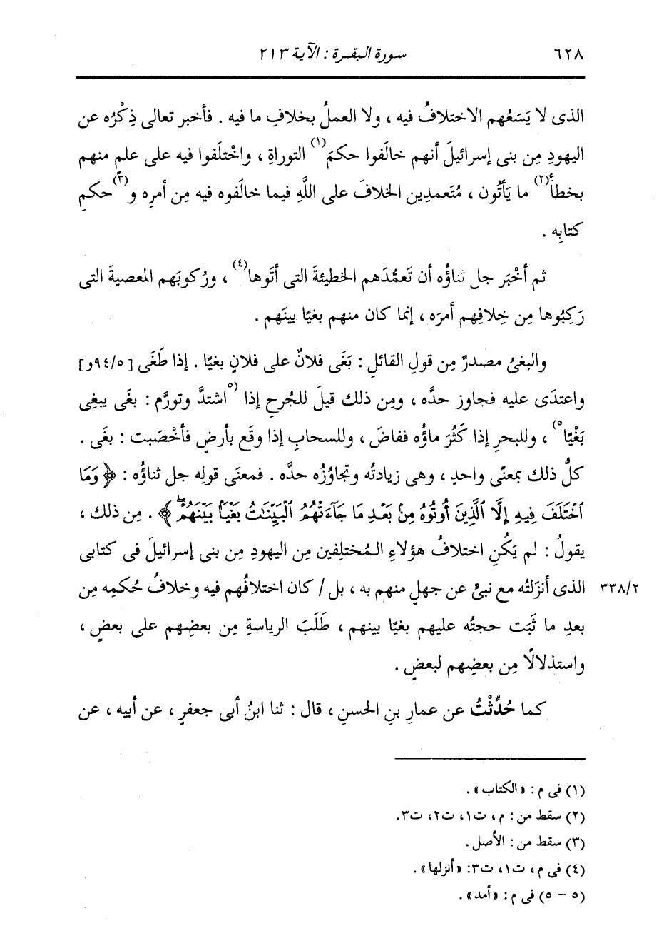 الَّذِي لَا يَسَعُهُمُ الِاخْتِلَافُ فِيهِ، وَلَا الْعَمَلُ بِخِلَافِ مَا فِيهِ. فَأَخْبَرَ عَزَّ ذِكْرُهُ عَنِ الْيَهُودِ مِنْ بَنِي إِسْرَائِيلَ أَنَّهُمْ خَالَفُوا الْكِتَابَ التَّوْرَاةَ، وَاخْتَلَفُوا فِيهِ عَلَى عِلْمٍ مِنْهُمْ، مَا يَأْتُونَ مُتَعَمِّدِينَ الْخِلَافَ عَلَى اللَّهِ فِيمَا خَالَفُوهُ فِيهِ مِنْ أَمْرِهِ وَحُكْمِ كِتَابِهِ. ثُمَّ أَخْبَرَ جَلَّ ذِكْرُهُ أَنَّ تَعَمُّدَهُمُ الْخَطِيئَةَ الَّتِي أَنْزَلَهَا، وَرَكُوبَهُمُ الْمَعْصِيَةَ الَّتِي رَكَبُوهَا مِنْ خِلَافِهِمْ أَمْرَهُ، إِنَّمَا كَانَ مِنْهُمْ بَغْيًا بَيْنَهُمْ.، وَالْبَغْي مَصْدَرٌ مِنْ قَوْلِ الْقَائِلِ: بَغَى فُلَانٌ عَلَى فُلَانٍ بَغْيًا إِذَا طَغَى، وَاعْتَدَى عَلَيْهِ فَجَاوَزَ حَدَّهُ، وَمِنْ ذَلِكَ قِيلَ لِلْجُرْحِ إِذَا أَمَدَّ، وَلِلْبَحْرِ إِذَا كَثُرَ مَاؤُهُ فَفَاضَ، وَلِلسَّحَابِ إِذَا وَقَعَ بِأَرْضٍ فَأَخْصَبَتْ: بَغْى كُلِّ ذَلِكَ بِمَعْنًى وَاحِدٍ، وَهِيَ زِيَادَتُهُ وَتَجَاوُزُ حَدِّهِ. فَمَعْنَى قَوْلِهِ جَلَّ ثَنَاؤُهُ: {وَمَا اخْتَلَفَ فِيهِ إِلَّا الَّذِينَ أُوتُوهُ مِنْ بَعْدِ مَا جَاءَتْهُمُ الْبَيِّنَاتُ بَغْيًا بَيْنَهُمْ} [البقرة: 213] مِنْ ذَلِكَ. يَقُولُ: لَمْ يَكُنِ اخْتِلَافُ هَؤُلَاءِ الْمُخْتَلِفِينَ مِنَ الْيَهُودِ مِنْ بَنِي إِسْرَائِيلَ فِي كِتَابِي الَّذِي أَنْزَلْتُهُ مَعَ نَبِيٍّ عَنْ جَهْلٍ مِنْهُمْ بِهِ، بَلْ كَانَ اخْتِلَافُهُمْ فِيهِ، وَخِلَافُ حُكْمِهِ مِنْ بَعْدِ مَا ثَبَتَتْ حُجَّتُهُ عَلَيْهِمْ بَغْيًا بَيْنَهُمْ، طَلَبَ الرِّيَاسَةِ مِنْ بَعْضِهِمْ عَلَى بَعْضٍ، وَاسْتِذْلَالًا مِنْ بَعْضِهِمْ لِبَعْضٍ