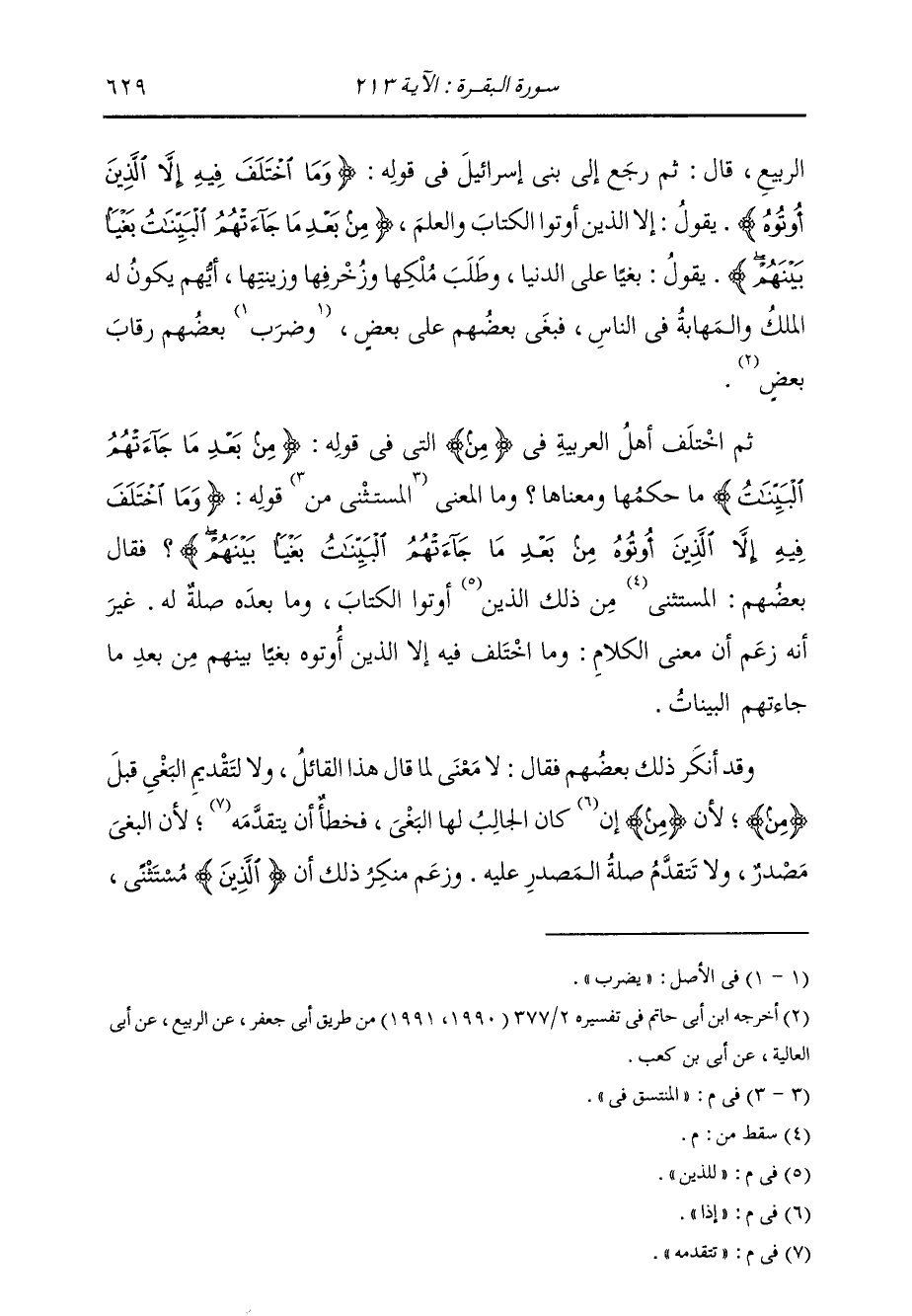 الرَّبِيعِ، قَالَ: " ثُمَّ رَجَعَ إِلَى بَنِي إِسْرَائِيلَ فِي قَوْلِهِ: {§وَمَا اخْتَلَفَ فِيهِ إِلَّا الَّذِينَ أُوتُوهُ} [البقرة: 213] يَقُولُ: إِلَّا الَّذِينَ أُوتُوا الْكِتَابَ، وَالْعِلْمَ {مِنْ بَعْدِ مَا جَاءَتْهُمُ الْبَيِّنَاتُ بَغْيًا بَيْنَهُمْ} [البقرة: 213] يَقُولُ: بَغْيًا عَلَى الدُّنْيَا وَطَلَبِ مُلْكِهَا وَزُخْرُفِهَا، وَزِينَتِهَا، أَيُّهُمْ يَكُونُ لَهُ الْمُلْكُ، وَالْمَهَابَةُ فِي النَّاسِ. فَبَغْى بَعْضِهِمْ عَلَى بَعْضٍ، وَضَرْبُ بَعْضِهِمْ رِقَابَ بَعْضٍ «ثُمَّ اخْتَلَفَ أَهْلُ الْعَرَبِيَّةِ فِي» مِنْ " الَّتِي فِي قَوْلِهِ: {مِنْ بَعْدِ مَا جَاءَتْهُمُ الْبَيِّنَاتُ} [البقرة: 213] مَا حُكْمُهَا وَمَعْنَاهَا؟ وَمَا الْمَعْنَى الْمُنْتَسِقُ فِي قَوْلِهِ {وَمَا اخْتَلَفَ فِيهِ إِلَّا الَّذِينَ أُوتُوهُ مِنْ بَعْدِ مَا جَاءَتْهُمُ الْبَيِّنَاتُ بَغْيًا بَيْنَهُمْ} [البقرة: 213] ؟ فَقَالَ بَعْضُهُمْ: مِنْ ذَلِكَ لِلَّذِينَ أُوتُوا الْكِتَابِ وَمَا بَعْدَهُ صِلَةٌ لَهُ. غَيْرَ أَنَّهُ زَعَمَ أَنَّ مَعْنَى الْكَلَامِ: وَمَا اخْتَلَفَ فِيهِ إِلَّا الَّذِينَ أُوتُوهُ بَغْيًا بَيْنَهُمْ مِنْ بَعْدِ مَا جَاءَتْهُمُ الْبَيِّنَاتُ. وَقَدْ أَنْكَرَ ذَلِكَ بَعْضُهُمْ فَقَالَ: لَا مَعْنَى لِمَا قَالَ هَذَا الْقَائِلُ، وَلَا لِتَقْدِيمِ الْبَغْيِ قَبْلَ «مِنْ» لِأَنَّ «مِنْ» إِذَا كَانَ الْجَالِبُ لَهَا الْبَغْيَ، فَخَطَأٌ أَنْ تَتَقَدَّمَهُ لِأَنَّ الْبَغْيَ مَصْدَرٌ، وَلَا تَتَقَدَّمُ صِلَةُ الْمَصْدَرِ عَلَيْهِ. وَزَعَمَ الْمُنْكِرُ ذَلِكَ أَنَّ «الَّذِينَ» مُسْتَثْنًى،