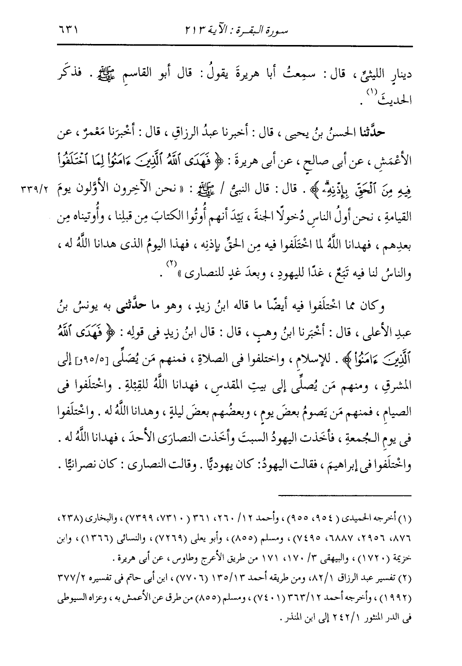 حَدَّثَنَا الْحَسَنُ بْنُ يَحْيَى، قَالَ: أَخْبَرَنَا عَبْدُ الرَّزَّاقِ، قَالَ: أَخْبَرَنَا مَعْمَرٌ، عَنِ الْأَعْمَشِ، عَنْ أَبِي صَالِحٍ، عَنْ أَبِي هُرَيْرَةَ: {§فَهَدَى اللَّهُ الَّذِينَ آمَنُوا لِمَا اخْتَلَفُوا فِيهِ مِنَ الْحَقِّ بِإِذْنِهِ} [البقرة: 213] قَالَ: قَالَ النَّبِيُّ صَلَّى اللهُ عَلَيْهِ وَسَلَّمَ: «وَنَحْنُ الْآخِرُونَ الْأَوَّلُونَ يَوْمَ الْقِيَامَةِ، نَحْنُ أَوَّلُ النَّاسِ دُخُولًا الْجَنَّةَ بِيَدَ أَنَّهُمْ أُوتُوا الْكِتَابَ مِنْ قَبْلِنَا وَأُوتِينَاهُ مِنْ بَعْدِهِمْ، فَهَدَانَا اللَّهُ لِمَا اخْتَلَفُوا فِيهِ مِنَ الْحَقِّ بِإِذْنِهِ فَهَذَا الْيَوْمُ الَّذِي هَدَانَا اللَّهُ لَهُ وَالنَّاسُ لَنَا فِيهِ تَبَعٌ، غَدًا لِلْيَهُودِ، وَبَعْدَ غَدٍ لِلنَّصَارَى» وَكَانَ مِمَّا اخْتَلَفُوا فِيهِ أَيْضًا مَا قَالَ ابْنُ زَيْدٍ