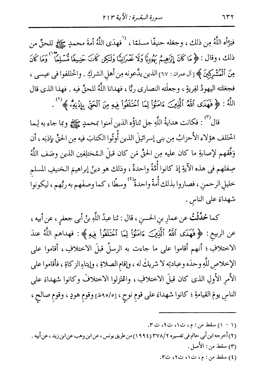 فَبَرَّأَهُ اللَّهُ مِنْ ذَلِكَ، وَجَعَلَهُ حَنِيفًا مُسْلِمًا، وَمَا كَانَ مِنَ الْمُشْرِكِينَ لِلَّذِينَ يَدْعُونَهُ مِنْ أَهْلِ الشِّرْكِ. وَاخْتَلَفُوا فِي عِيسَى، فَجَعَلَتْهُ الْيَهُودُ لِفِرْيَةٍ، وَجَعَلَتْهُ النَّصَارَى رَبًّا، فَهَدَانَا اللَّهُ لِلْحَقِّ فِيهِ؛ فَهَذَا الَّذِي قَالَ جَلَّ ثَنَاؤُهُ. {فَهَدَى اللَّهُ الَّذِينَ آمَنُوا لِمَا اخْتَلَفُوا فِيهِ مِنَ الْحَقِّ بِإِذْنِهِ} [البقرة: 213] " قَالَ: فَكَانَتْ هِدَايَةُ اللَّهِ جَلَّ ثَنَاؤُهُ الَّذِينَ آمَنُوا بِمُحَمَّدٍ، وَبِمَا جَاءَ بِهِ لِمَا اخْتَلَفَ هَؤُلَاءِ الْأَحْزَابُ مِنْ بَنِي إِسْرَائِيلَ الَّذِينَ أُوتُوا الْكِتَابَ فِيهِ مِنَ الْحَقِّ بِإِذْنِهِ أَنْ وَفَّقَهُمْ لِإِصَابَةِ مَا كَانَ عَلَيْهِ مِنَ الْحَقِّ مَنْ كَانَ قَبْلَ الْمُخْتَلِفِينَ الَّذِينَ وَصَفَ اللَّهُ صِفَتَهُمْ فِي هَذِهِ الْآيَةِ إِذْ كَانُوا أُمَّةً وَاحِدَةً، وَذَلِكَ هُوَ دِينُ إِبْرَاهِيمَ الْحَنِيفِ الْمُسْلِمِ خَلِيلِ الرَّحْمَنِ، فَصَارُوا بِذَلِكَ أُمَّةً وَسَطًا، كَمَا وَصَفَهُمْ بِهِ رَبُّهُمْ لِيَكُونُوا شُهَدَاءَ عَلَى النَّاسِ "
