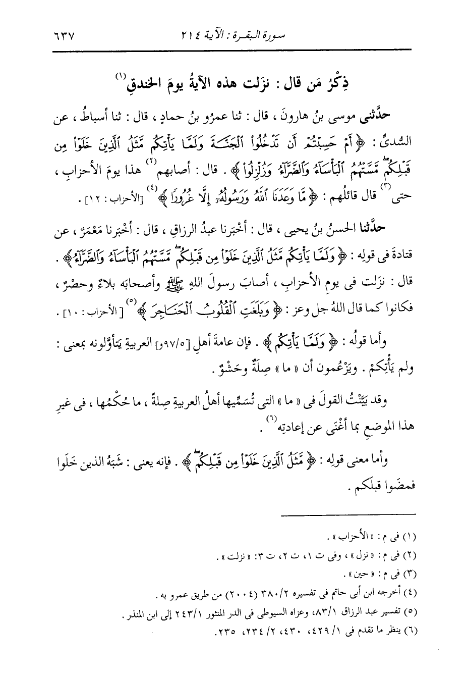 حَدَّثَنِي مُوسَى بْنُ هَارُونَ، قَالَ: ثنا عَمْرٌو، قَالَ: ثنا أَسْبَاطٌ، عَنِ السُّدِّيِّ: " {§أَمْ حَسِبْتُمْ أَنْ تَدْخُلُوا، الْجَنَّةَ وَلَمَّا يَأْتِكُمْ مَثَلُ الَّذِينَ خَلَوْا مِنْ قَبْلِكُمْ مَسَّتْهُمُ الْبَأْسَاءُ وَالضَّرَّاءُ وَزُلْزِلُوا} [البقرة: 214] قَالَ: نَزَلَ هَذَا يَوْمَ الْأَحْزَابِ حِينَ قَالَ قَائِلُهُمْ: {مَا وَعَدَنَا اللَّهُ وَرَسُولُهُ إِلَّا غُرُورًا} [الأحزاب: 12] "