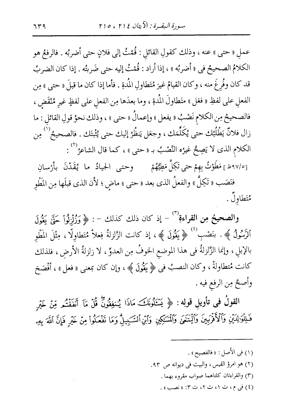 فَنَصَبَ تَكِلَّ وَالْفِعْلُ الَّذِي بَعْدَ حَتَّى مَاضٍ، لِأَنَّ الَّذِي قَبْلَهَا مِنَ الْمَطْوِ مُتَطَاوِلٌ، وَالصَّحِيحُ مِنَ الْقِرَاءَةِ إِذَا كَانَ ذَلِكَ كَذَلِكَ «وَزُلْزِلُوا حَتَّى يَقُولَ الرَّسُولُ» ، نَصْبُ يَقُولَ، إِذْ كَانَتِ الزَّلْزَلَةُ فِعْلًا مُتَطَاوِلًا، مِثْلَ الْمَطْوِ بِالْإِبِلِ. وَإِنَّمَا الزَّلْزَلَةُ فِي هَذَا الْمَوْضِعِ: الْخَوْفُ مِنَ الْعَدُوِّ، لَا زَلْزَلَةُ الْأَرْضِ، فَلِذَلِكَ كَانَتْ مُتَطَاوِلَةً وَكَانَ النَّصْبُ فِي «يَقُولُ» وَإِنْ كَانَ بِمَعْنَى «فَعَلَ» أَفْصَحَ وَأَصَحَّ مِنَ الرَّفْعِ فِيهِ