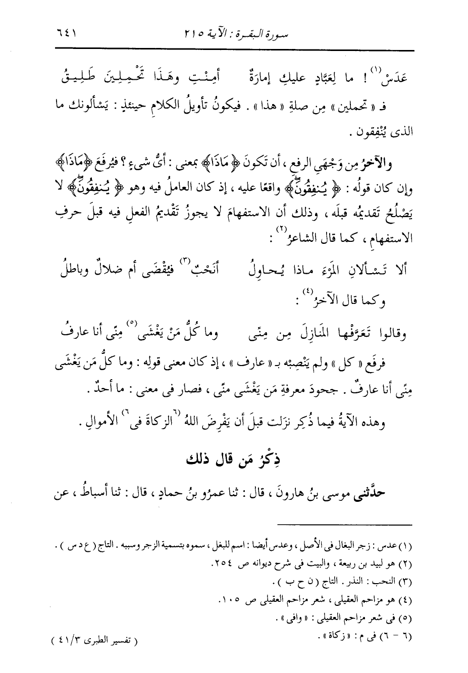 ذِكْرُ مَنْ قَالَ ذَلِكَ حَدَّثَنِي مُوسَى بْنُ هَارُونَ، قَالَ: ثنا عَمْرُو بْنُ حَمَّادٍ، قَالَ: ثنا أَسْبَاطٌ، عَنِ -[642]- السُّدِّيِّ: " {§يَسْأَلُونَكَ مَاذَا يُنْفِقُونَ قُلْ مَا أَنْفَقْتُمْ مِنْ خَيْرٍ فَلِلْوَالِدَيْنِ وَالْأَقْرَبِينَ} [البقرة: 215] قَالَ: يَوْمَ نَزَلَتْ هَذِهِ الْآيَةُ لَمْ تَكُنْ زَكَاةٌ، وَإِنَّمَا هِيَ النَّفَقَةُ يُنْفِقُهَا الرَّجُلُ عَلَى أَهْلِهِ وَالصَّدَقَةُ يَتَصَدَّقُ بِهَا فَنَسَخَتْهَا الزَّكَاةُ "