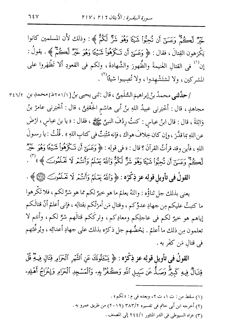 §الْقَوْلُ فِي تَأْوِيلِ قَوْلِهِ تَعَالَى: {وَاللَّهُ يَعْلَمُ وَأَنْتُمْ لَا تَعْلَمُونَ} [البقرة: 216] يَعْنِي بِذَلِكَ جَلَّ ثَنَاؤُهُ: وَاللَّهُ يَعْلَمُ مَا هُوَ خَيْرٌ لَكُمْ مِمَّا هُوَ شَرٌّ لَكُمْ، فَلَا تَكْرَهُوا مَا كَتَبْتُ عَلَيْكُمْ مِنْ جِهَادِ عَدُوِّكُمْ، وَقِتَالِ مِنْ أَمَرْتُكُمْ بِقِتَالِهِ، فَإِنِّي أَعْلَمُ أَنَّ قِتَالَكُمْ إِيَّاهُمْ، هُوَ خَيْرٌ لَكُمْ فِي عَاجِلِكُمْ، وَمَعَادِكُمْ، وَتَرْكِكُمْ قِتَالَهُمْ شَرٌّ لَكُمْ، وَأَنْتُمْ لَا تَعْلَمُونَ مِنْ ذَلِكَ مَا أَعْلَمُ، يَحُضُّهُمْ جَلَّ ذِكْرُهُ بِذَلِكَ عَلَى جِهَادِ أَعْدَائِهِ، وَيُرَغِّبُهُمْ فِي قِتَالِ مَنْ كَفَرَ بِهِ