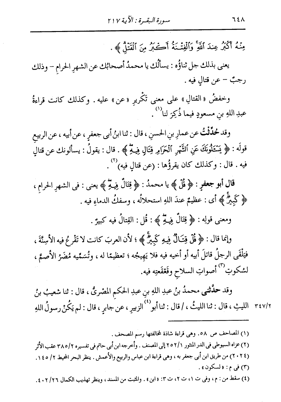 وَقَدْ حُدِّثْتُ عَنْ عَمَّارِ بْنِ الْحَسَنِ، قَالَ: ثنا ابْنُ أَبِي جَعْفَرٍ، عَنْ أَبِيهِ، عَنِ الرَّبِيعِ، قَوْلَهُ: " {§يَسْأَلُونَكَ عَنِ الشَّهْرِ الْحَرَامِ قِتَالٍ فِيهِ} [البقرة: 217] قَالَ: يَقُولُ: يَسْأَلُونَكَ عَنْ قِتَالٍ فِيهِ، قَالَ: وَكَذَلِكَ كَانَ يَقْرَؤُهَا: «عَنْ قِتَالٍ فِيهِ» قَالَ أَبُو جَعْفَرٍ: قُلْ يَا مُحَمَّدُ قِتَالٌ فِيهِ، يَعْنِي فِي الشَّهْرِ الْحَرَامِ كَبِيرٌ: أَيْ عَظِيمٌ عِنْدَ اللَّهِ اسْتِحْلَالُهُ، وَسَفْكُ الدِّمَاءِ فِيهِ. وَمَعْنَى قَوْلِهِ: {قِتَالٌ فِيهِ} [البقرة: 217] قُلِ الْقِتَالُ فِيهِ كَبِيرٌ. وَإِنَّمَا قَالَ: قُلْ قِتَالٌ فِيهِ كَبِيرٌ؛ لِأَنَّ الْعَرَبَ كَانَتْ لَا تَقْرَعُ فِيهِ الْأَسِنَّةَ، فَيَلْقَى الرَّجُلُ قَاتِلَ أَبِيهِ أَوِ أَخِيهِ فِيهِ فَلَا يَهِيجُهُ تَعْظِيمًا لَهُ، وَتُسَمِّيهِ مُضَرُ «الْأَصَمَّ» لِسُكُونِ أَصْوَاتِ السِّلَاحِ، وَقَعْقَعَتِهِ فِيهِ