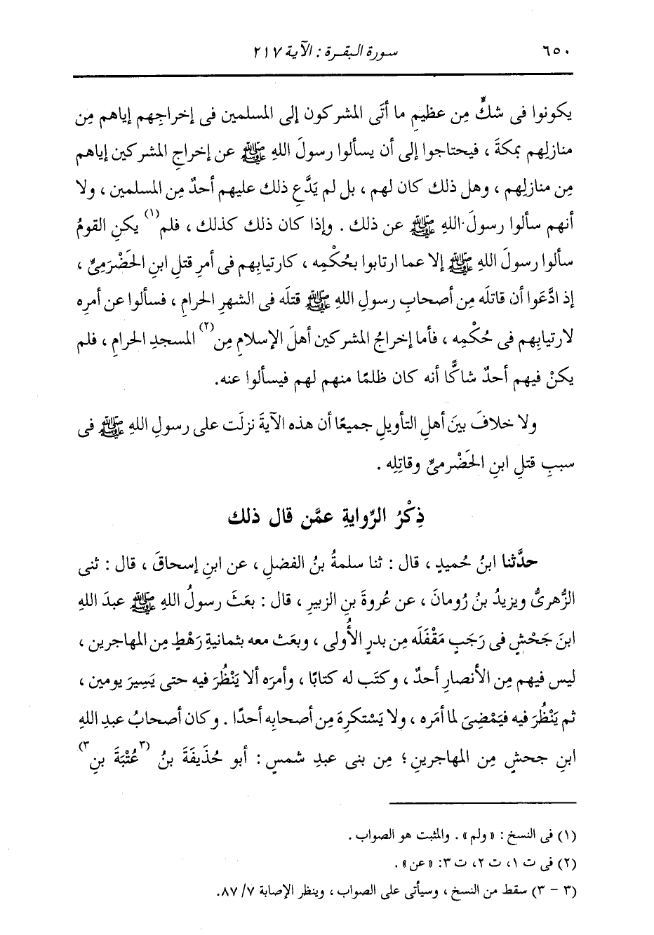 ذِكْرُ الرِّوَايَةِ عَمَّنْ قَالَ ذَلِكَ حَدَّثَنَا ابْنُ حُمَيْدٍ، قَالَ: ثنا سَلَمَةُ بْنُ الْفَضْلِ، عَنِ ابْنِ إِسْحَاقَ، قَالَ: ثني الزُّهْرِيُّ، وَيَزِيدُ بْنُ رُومَانَ، عَنْ عُرْوَةَ بْنِ الزُّبَيْرِ، قَالَ: " بَعَثَ رَسُولُ اللَّهِ صَلَّى اللهُ عَلَيْهِ وَسَلَّمَ عَبْدَ اللَّهِ بْنَ جَحْشٍ فِي رَجَبٍ مَقْفَلَهُ مِنْ بَدْرٍ الْأُولَى، وَبَعَثَ مَعَهُ بِثَمَانِيَةِ رَهْطٍ مِنَ الْمُهَاجِرِينَ، لَيْسَ فِيهِمْ مِنَ الْأَنْصَارِ أَحَدٌ، وَكَتَبَ لَهُ كِتَابًا، وَأَمَرَهُ أَنْ لَا يَنْظُرَ فِيهِ حَتَّى يَسِيرَ يَوْمَيْنِ ثُمَّ يَنْظُرُ فِيهِ فَيَمْضِي لِمَا أَمَرَهُ، وَلَا يَسْتَكْرِهُ مِنْ أَصْحَابِهِ أَحَدًا. وَكَانَ أَصْحَابُ عَبْدِ اللَّهِ بْنِ جَحْشٍ، مِنَ الْمُهَاجِرِينَ مِنْ بَنِي عَبْدِ شَمْسٍ أَبُو حُذَيْفَةَ بْنُ رَبِيعَةَ، وَمِنْ بَنِي أُمَيَّةَ بْنِ -[651]- عَبْدِ شَمْسٍ، ثُمَّ مِنْ حُلَفَائِهِمْ عَبْدُ اللَّهِ بْنُ جَحْشِ بْنِ رِيَابٍ، وَهُوَ أَمِيرُ الْقَوْمِ، وَعُكَّاشَةُ بْنُ مِحْصَنِ بْنِ حَرْثَانَ أَحَدُ بَنِي أَسَدِ بْنِ خُزَيْمَةَ، وَمِنْ بَنِي نَوْفَلِ بْنِ عَبْدِ مَنَافٍ عُتْبَةُ بْنُ غَزْوَانَ حَلِيفٌ لَهُمْ، وَمَنْ بَنِي زُهْرَةَ بْنِ كِلَابٍ: سَعْدُ بْنُ أَبِي وَقَّاصٍ، وَمِنْ بَنِي عَدِيِّ بْنِ كَعْبٍ عَامِرُ بْنُ رَبِيعَةَ حَلِيفٌ لَهُمْ، وواقدُ بْنُ عَبْدِ اللَّهِ بْنِ مَنَاةَ بْنِ عُوَيْمِ بْنِ ثَعْلَبَةَ بْنِ يَرْبُوعِ بْنِ حَنْظَلَةَ، وَخَالِدُ بْنُ الْبُكَيْرِ أَحَدُ بَنِي سَعْدِ بْنِ لَيْثٍ حَلِيفٌ لَهُمْ، وَمِنْ بَنِي الْحَرْثِ بْنِ فِهْرٍ سُهَيْلُ بْنُ بَيْضَاءَ. فَلَمَّا سَارَ عَبْدُ اللَّهِ بْنُ جَحْشٍ، يَوْمَيْنِ فَتَحَ الْكِتَابَ وَنَظَرَ فِيهِ، فَإِذَا فِيهِ: وَإِذَا نَظَرْتَ إِلَى كِتَابِي هَذَا، فَسِرْ حَتَّى تَنْزِلَ نَخْلَةَ بَيْنَ مَكَّةَ وَالطَّائِفِ، فَتَرْصُدَ بِهَا قُرَيْشًا، وَتَعْلَمَ لَنَا مِنْ أَخْبَارِهِمْ. فَلَمَّا نَظَرَ عَبْدُ اللَّهِ بْنُ جَحْشٍ، فِي الْكِتَابِ قَالَ: سَمْعًا وَطَاعَةً ثُمَّ قَالَ لِأَصْحَابِهِ: قَدْ أَمَرَنِي رَسُولُ اللَّهِ صَلَّى اللهُ عَلَيْهِ وَسَلَّمَ أَنْ أَمْضِيَ إِلَى نَخْلَةَ فَأَرْصَدَ بِهَا قُرَيْشًا حَتَّى آتِيَهُ مِنْهُمْ بِخَبَرٍ، وَقَدْ نَهَانِي أَنْ أَسْتَكْرِهَ أَحَدًا مِنْكُمْ، فَمَنْ كَانَ مِنْكُمْ يُرِيدُ الشَّهَادَةَ وَيَرْغَبُ فِيهَا فَلْيَنْطَلِقْ، وَمَنْ كَرِهَ ذَلِكَ فَلْيَرْجِعْ، فَأَمَّا أَنَا فَمَاضٍ لِأَمْرِ رَسُولِ اللَّهِ صَلَّى اللهُ عَلَيْهِ وَسَلَّمَ فَمَضَى وَمَضَى أَصْحَابُهُ مَعَهُ، فَلَمْ يَتَخَلَّفْ عَنْهُ أَحَدٌ، وَسَلَكَ عَلَى الْحِجَازِ، حَتَّى إِذَا كَانَ بِمَعْدِنَ فَوْقَ الْفُرْعِ يُقَالُ لَهُ بُحْرَانُ، أَضَلَّ سَعْدُ بْنُ أَبِي وَقَّاصٍ، وَعُتْبَةُ بْنُ غَزْوَانَ بَعِيرًا لَهُمَا كَانَا عَلَيْهِ يَعْتَقِبَانِهِ، فَتَخَلَّفَا عَلَيْهِ فِي طَلَبِهِ، وَمَضَى عَبْدُ اللَّهِ بْنُ جَحْشٍ وَبَقِيَّةُ أَصْحَابِهِ حَتَّى نَزَلَ بِنَخْلَةَ، فَمَرَّتْ بِهِ عِيرٌ لِقُرَيْشٍ -[652]- تَحْمِلُ زَبِيبًا، وَأُدْمًا، وَتِجَارَةً مِنْ تِجَارَةِ قُرَيْشٍ فِيهَا مِنْهُمْ عَمْرُو بْنُ الْحَضْرَمِيِّ، وَعُثْمَانُ بْنُ عَبْدِ اللَّهِ بْنِ الْمُغِيرَةِ، وَأَخُوهُ نَوْفَلُ بْنُ عَبْدِ اللَّهِ بْنِ الْمُغِيرَةِ الْمَخْزُومِيَّانِ، وَالْحَكَمُ بْنُ كَيْسَانَ مَوْلَى هِشَامِ بْنِ الْمُغِيرَةِ فَلَمَّا رَآهُمُ الْقَوْمُ هَابُوهُمْ، وَقَدْ نَزَلُوا قَرِيبًا مِنْهُمْ، فَأَشْرَفَ لَهُمْ عُكَّاشَةُ بْنُ مِحْصَنٍ، وَقَدْ كَانَ حَلَقَ رَأْسَهُ؛ فَلَمَّا رَأَوْهُ آمَنُوا، وَقَالُوا: عُمَّارٌ، لَا بَأْسَ عَلَيْنَا مِنْهُمْ، وَتَشَاوَرَ الْقَوْمُ فِيهِمْ، وَذَلِكَ فِ