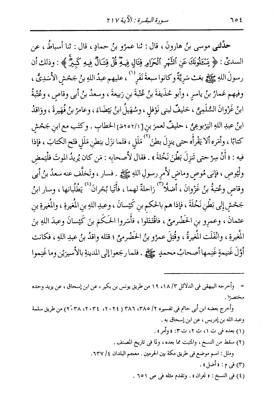 حَدَّثَنِي مُوسَى بْنُ هَارُونَ، قَالَ: ثنا عَمْرُو بْنُ حَمَّادٍ، قَالَ: ثنا أَسْبَاطٌ، عَنِ السُّدِّيِّ: " {§يَسْأَلُونَكَ عَنِ الشَّهْرِ الْحَرَامِ قِتَالٍ فِيهِ قُلْ قِتَالٍ فِيهِ كَبِيرٌ} [البقرة: 217] وَذَلِكَ أَنَّ رَسُولَ اللَّهِ صَلَّى اللهُ عَلَيْهِ وَسَلَّمَ بَعَثَ سَرِيَّةً وَكَانُوا سَبْعَةَ نَفَرٍ، وَأَمَّرَ عَلَيْهِمْ عَبْدَ اللَّهِ بْنَ جَحْشٍ الْأَسَدِيَّ، وَفِيهِمْ عَمَّارُ بْنُ يَاسِرٍ، وَأَبُو حُذَيْفَةَ بْنُ عُتْبَةَ بْنِ رَبِيعَةَ، وَسَعْدُ بْنُ أَبِي وَقَّاصٍ، وَعُتْبَةُ بْنُ غَزْوَانَ السُّلَمِيُّ حَلِيفٌ لِبَنِي نَوْفَلٍ، وَسُهَيْلُ بْنُ بَيْضَاءَ، وَعَامِرُ بْنُ فُهَيْرَةَ، وواقدُ بْنُ عَبْدِ اللَّهِ الْيَرْبُوعِيُّ حَلِيفٌ لِعُمَرَ بْنِ الْخَطَّابِ وَكَتَبَ مَعَ ابْنِ جَحْشٍ كِتَابًا وَأَمَرَهُ أَنْ لَا يَقْرَأَهُ حَتَّى يَنْزِلَ مَلَلَ، فَلَمَّا نَزَلَ بِبَطْنِ مَلَلَ فَتَحَ الْكِتَابَ، فَإِذَا فِيهِ: أَنْ سِرْ حَتَّى تَنْزِلَ بَطْنَ نَخْلَةَ. فَقَالَ لِأَصْحَابِهِ: مَنْ كَانَ يُرِيدُ الْمَوْتَ فَلْيَمْضِ وَلْيُوصِ، فَإِنِّي مُوصٍ، وَمَاضٍ لِأَمْرِ رَسُولِ اللَّهِ صَلَّى اللهُ عَلَيْهِ وَسَلَّمَ فَسَارَ وَتَخَلَّفَ عَنْهُ سَعْدُ بْنُ أَبِي وَقَّاصٍ، وَعُتْبَةُ بْنُ غَزْوَانَ أَضَلَّا رَاحِلَةً لَهُمَا، فَأَتَيَا بُحْرَانَ يَطْلُبَانِهَا، وَسَارَ ابْنُ جَحْشٍ إِلَى بَطْنِ نَخْلَةَ، فَإِذَا هُمْ بِالْحَكَمِ بْنِ كَيْسَانَ، وَعَبْدُ اللَّهِ بْنُ الْمُغِيرَةِ، وَالْمُغِيرَةُ بْنُ عُثْمَانَ، وَعَمْرُو بْنُ الْحَضْرَمِيِّ. فَاقْتَتَلُوا، فَأَسَرُوا الْحَكَمَ بْنَ كَيْسَانَ، وَعَبْدَ اللَّهِ بْنَ الْمُغِيرَةِ، وَانْفَلَتَ الْمُغِيرَةُ، وَقُتِلَ عَمْرُو بْنُ الْحَضْرَمِيِّ، قَتَلَهُ وَاقِدُ بْنُ عَبْدِ اللَّهِ، فَكَانَتْ أَوَّلَ غَنِيمَةٍ غَنَمَهَا أَصْحَابُ مُحَمَّدٍ صَلَّى اللهُ عَلَيْهِ وَسَلَّمَ فَلَمَّا رَجَعُوا إِلَى الْمَدِينَةِ بِالْأَسِيرَيْنِ وَمَا غَنِمُوا -[655]- مِنَ الْأَمْوَالِ أَرَادَ أَهْلُ مَكَّةَ أَنْ يُفَادُوا بِالْأَسِيرَيْنِ، فَقَالَ النَّبِيُّ صَلَّى اللهُ عَلَيْهِ وَسَلَّمَ: «حَتَّى نَنْظُرَ مَا فَعَلَ صَاحِبَانَا» ؛ فَلَمَّا رَجَعَ سَعْدٌ وَصَاحِبُهُ فَادَى بِالْأَسِيرَيْنِ، فَفَجَرَ عَلَيْهِ الْمُشْرِكُونَ، وَقَالُوا: مُحَمَّدٌ يَزْعُمُ أَنَّهُ يَتَّبِعُ طَاعَةَ اللَّهِ، وَهُوَ أَوَّلُ مَنِ اسْتَحَلَّ الشَّهْرَ الْحَرَامَ وَقَتَلَ صَاحِبَنَا فِي رَجَبٍ، فَقَالَ الْمُسْلِمُونَ: إِنَّمَا قَتَلْنَاهُ فِي جُمَادَى، وَقِيلَ فِي أَوَّلِ لَيْلَةٍ مِنْ رَجَبٍ، وَآخِرَ لَيْلَةٍ مِنْ جُمَادَى وَأَغْمَدَ الْمُسْلِمُونَ سُيُوفَهُمْ حِينَ دَخَلَ رَجَبٌ، فَأَنْزَلَ اللَّهُ جَلَّ وَعَزَّ يُعَيِّرُ أَهْلَ مَكَّةَ: {يَسْأَلُونَكَ عَنِ الشَّهْرِ الْحَرَامِ قِتَالٍ فِيهِ قُلْ قِتَالٌ فِيهِ كَبِيرٌ} [البقرة: 217] لَا يَحِلُّ، وَمَا صَنَعْتُمْ أَنْتُمْ يَا مَعْشَرَ الْمُشْرِكِينَ أَكْبَرُ مِنَ الْقَتْلِ فِي الشَّهْرِ الْحَرَامِ، حِينَ كَفَرْتُمْ بِاللَّهِ، وَصَدَدْتُمْ عَنْهُ مُحَمَّدًا وَأَصْحَابَهُ، وَإِخْرَاجُ أَهْلٍ الْمَسْجِدٍ الْحَرَامٍ مِنْهُ حِينَ أَخْرَجُوا مُحَمَّدًا أَكْبَرُ مِنَ الْقَتْلِ عِنْدَ اللَّهِ، وَالْفِتْنَةُ هِيَ الشِّرْكُ أَعْظَمُ عِنْدَ اللَّهِ مِنَ الْقَتْلِ فِي الشَّهْرِ الْحَرَامِ، فَذَلِكَ قَوْلُهُ: {وَصَدٌّ عَنْ سَبِيلِ اللَّهِ وَكُفْرٌ بِهِ، وَالْمَسْجِدِ الْحَرَامِ وَإِخْرَاجُ أَهْلِهِ مِنْهُ أَكْبَرُ عِنْدَ اللَّهِ وَالْفِتْنَةُ أَكْبَرُ مِنَ الْقَتْلِ} [البقرة: 217] "