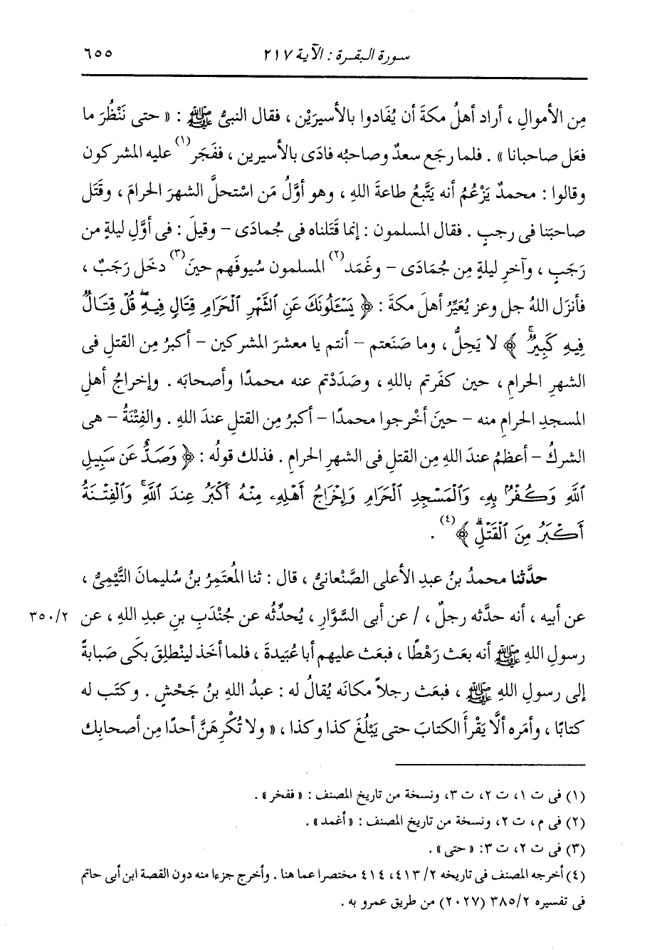 حَدَّثَنَا مُحَمَّدُ بْنُ عَبْدِ الْأَعْلَى الصَّنْعَانِيُّ، قَالَ: ثنا الْمُعْتَمِرُ بْنُ سُلَيْمَانَ التَّيْمِيُّ، عَنْ أَبِيهِ، أَنَّهُ حَدَّثَهُ رَجُلٌ، عَنْ أَبِي السَّوَّارِ يُحَدِّثُهُ، عَنْ جُنْدُبِ بْنِ عَبْدِ اللَّهِ: " عَنْ رَسُولِ اللَّهِ صَلَّى اللهُ عَلَيْهِ وَسَلَّمَ أَنَّهُ بَعَثَ رَهْطًا، فَبَعَثَ عَلَيْهِمْ أَبَا عُبَيْدَةَ؛ فَلَمَّا آخَذَ لِيَنْطَلِقْ بَكَى صَبَابَةً إِلَى رَسُولِ اللَّهِ صَلَّى اللهُ عَلَيْهِ وَسَلَّمَ، فَبَعَثَ رَجُلًا مَكَانَهُ يُقَالُ لَهُ عَبْدُ اللَّهِ بْنُ جَحْشٍ، وَكَتَبَ لَهُ كِتَابًا، وَأَمَرَهُ أَنْ لَا يَقْرَأَ الْكِتَابَ حَتَّى يَبْلُغَ كَذَا وَكَذَا، وَلَا تُكْرِهَنَّ أَحَدًا مِنْ أَصْحَابِكَ -[656]- عَلَى السَّيْرِ مَعَكَ. فَلَمَّا قَرَأَ الْكِتَابَ اسْتَرْجَعَ، وَقَالَ: سَمْعًا وَطَاعَةً لِأَمْرِ اللَّهِ وَرَسُولِهِ. فَخَبَّرَهُمُ الْخَبَرَ، وَقَرَأَ عَلَيْهِمُ الْكِتَابَ. فَرَجَعَ رَجُلَانِ وَمَضَى بَقِيَّتُهُمْ. فَلَقُوا ابْنَ الْحَضْرَمِيِّ، فَقَتَلُوهُ، وَلَمْ يَدْرُوا ذَلِكَ الْيَوْمَ مِنْ رَجَبٍ أَوْ مِنْ جُمَادَى؟ فَقَالَ الْمُشْرِكُونَ لِلْمُسْلِمِينَ: فَعَلْتُمْ كَذَا وَكَذَا فِي الشَّهْرِ الْحَرَامِ فَأَتَوْا النَّبِيَّ صَلَّى اللهُ عَلَيْهِ وَسَلَّمَ فَحَدَّثُوهُ الْحَدِيثَ، فَأَنْزَلَ اللَّهُ عَزَّ وَجَلَّ: {§يَسْأَلُونَكَ عَنِ الشَّهْرِ الْحَرَامِ قِتَالٍ فِيهِ قُلْ قِتَالٌ فِيهِ كَبِيرٌ وَصَدٌّ عَنْ سَبِيلِ اللَّهِ وَكُفْرٌ بِهِ وَالْمَسْجِدِ الْحَرَامِ وَإِخْرَاجُ أَهْلِهِ مِنْهُ أَكْبَرُ عِنْدَ اللَّهِ وَالْفِتْنَةُ أَكْبَرُ مِنَ الْقَتْلِ} [البقرة: 217] وَالْفِتْنَةُ: هِيَ الشِّرْكُ " وَقَالَ بَعْضُ الَّذِينَ أَظُنُّهُ قَالَ: كَانُوا فِي السَّرِيَّةِ: وَاللَّهِ مَا قَتَلَهُ إِلَّا وَاحِدٌ، فَقَالَ: إِنْ يَكُنْ خَيْرًا فَقَدْ وَلَّيْتُ. وَإِنْ يَكُنْ ذَنْبًا فَقَدْ عَمِلْتُ