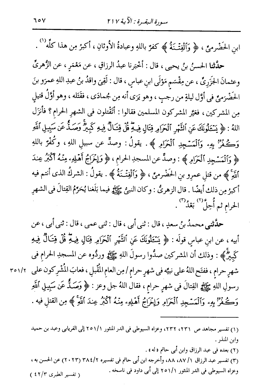 حَدَّثَنَا الْحَسَنُ بْنُ يَحْيَى، قَالَ، أَخْبَرَنَا عَبْدُ الرَّزَّاقِ، عَنْ مَعْمَرٍ، عَنِ الزُّهْرِيِّ، وَعُثْمَانَ الْجَزَرِيِّ، عَنْ مِقْسَمٍ، مَوْلَى ابْنِ عَبَّاسٍ، قَالَ: " لَقِيَ وَاقِدُ بْنُ عَبْدِ اللَّهِ، عَمْرَو بْنَ الْحَضْرَمِيِّ فِي أَوَّلِ لَيْلَةٍ مِنْ رَجَبٍ، وَهُوَ يَرَى أَنَّهُ مِنْ جُمَادَى فَقَتَلَهُ، وَهُوَ أَوَّلُ قَتِيلٍ مِنَ الْمُشْرِكِينَ، فَعَيَّرَ الْمُشْرِكُونَ الْمُسْلِمِينَ فَقَالُوا: أَتَقْتُلُونَ فِي الشَّهْرِ الْحَرَامِ؟ فَأَنْزَلَ اللَّهُ {§يَسْأَلُونَكَ عَنِ الشَّهْرِ الْحَرَامِ قِتَالٍ فِيهِ قُلْ قِتَالٌ فِيهِ كَبِيرٌ وَصَدٌّ عَنْ سَبِيلِ اللَّهِ وَكُفْرٌ بِهِ وَالْمَسْجِدِ الْحَرَامِ} [البقرة: 217] يَقُولُ: وَصَدٌّ عَنْ سَبِيلِ اللَّهِ، وَكُفْرٌ بِاللَّهِ وَالْمَسْجِدِ الْحَرَامِ، وَصَدٌّ عَنِ الْمَسْجِدِ الْحَرَامِ {وَإِخْرَاجُ أَهْلِهِ مِنْهُ أَكْبَرُ عِنْدَ اللَّهِ} [البقرة: 217] مِنْ قَتْلِ عَمْرِو بْنِ الْحَضْرَمِيِّ؛ وَالْفِتْنَةُ: يَقُولُ: الشِّرْكُ الَّذِي أَنْتُمْ فِيهِ أَكْبَرُ مِنْ ذَلِكَ أَيْضًا " قَالَ الزُّهْرِيُّ: وَكَانَ النَّبِيُّ صَلَّى اللهُ عَلَيْهِ وَسَلَّمَ فِيمَا بَلَغَنَا يُحَرِّمُ الْقِتَالَ فِي الشَّهْرِ الْحَرَامِ ثُمَّ أَحَلَّ بَعْدَ