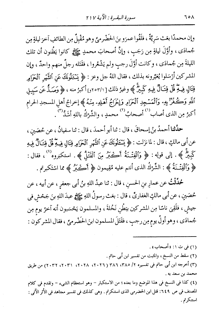 حَدَّثَنَا أَحْمَدُ بْنُ إِسْحَاقَ، قَالَ: ثنا أَبُو أَحْمَدَ، قَالَ: ثنا سُفْيَانُ، عَنْ حُصَيْنٍ، عَنْ أَبِي مَالِكٍ، قَالَ: " §لَمَّا نَزَلَتْ: {يَسْأَلُونَكَ عَنِ الشَّهْرِ الْحَرَامِ، قِتَالٍ فِيهِ قُلْ قِتَالٌ فِيهِ كَبِيرٌ} [البقرة: 217] إِلَى قَوْلِهِ: {وَالْفِتْنَةُ أَكْبَرُ مِنَ الْقَتْلِ} [البقرة: 217] اسْتَكْبَرُوهُ، فَقَالَ: وَالْفِتْنَةُ: الشِّرْكُ الَّذِي أَنْتُمْ عَلَيْهِ مُقِيمُونَ أَكْبَرُ مِمَّا اسْتَكْبَرْتُمْ "