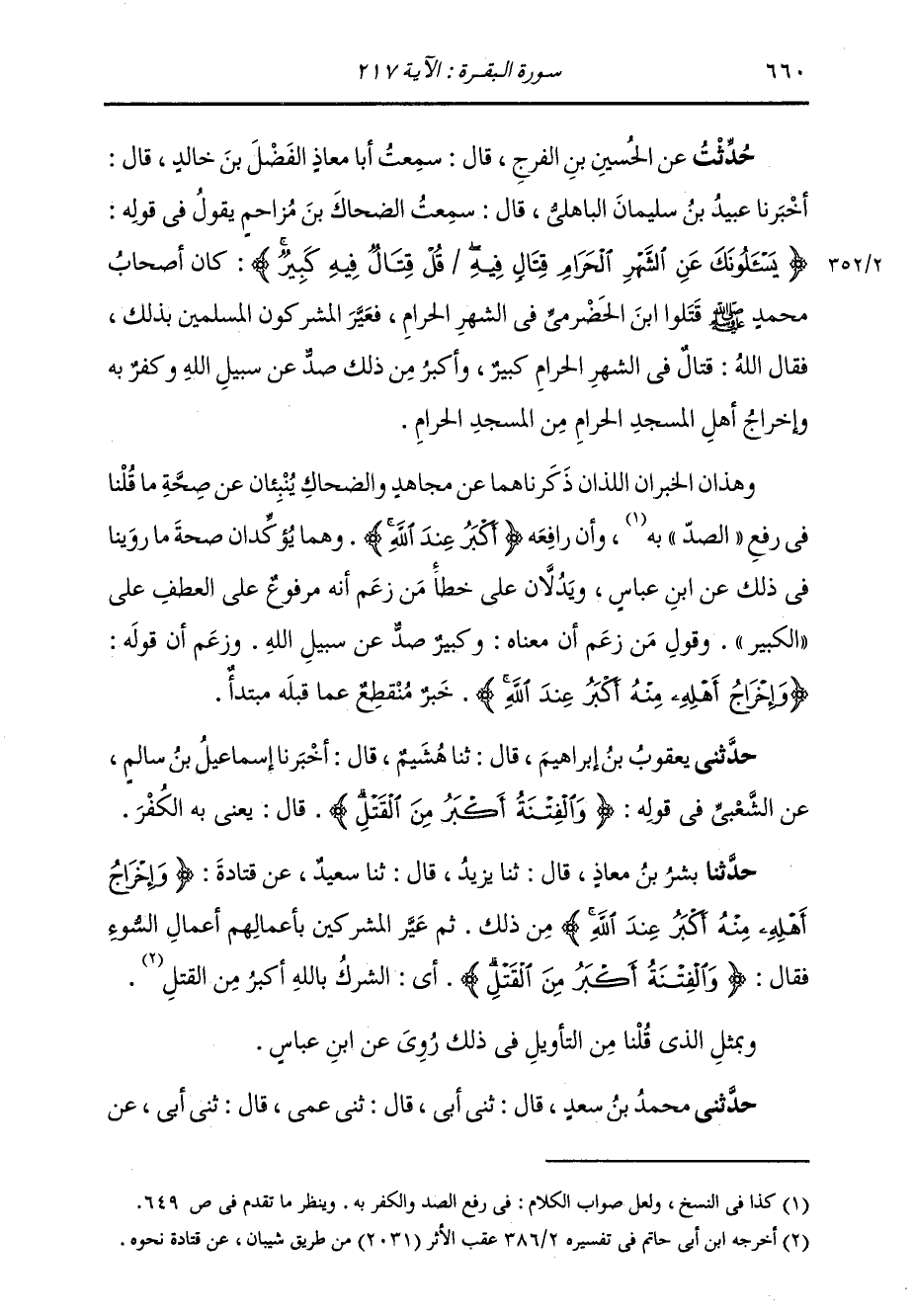 حُدِّثْتُ عَنِ الْحُسَيْنِ بْنِ الْفَرَجِ، قَالَ: سَمِعْتُ أَبَا مُعَاذٍ الْفَضْلَ بْنَ خَالِدٍ، قَالَ: أَخْبَرَنَا عُبَيْدُ بْنُ سُلَيْمَانَ الْبَاهِلِيُّ، قَالَ: سَمِعْتُ الضَّحَّاكَ بْنَ مُزَاحِمٍ، يَقُولُ فِي قَوْلِهِ: " {§يَسْأَلُونَكَ عَنِ الشَّهْرِ الْحَرَامِ، قِتَالٍ فِيهِ قُلْ قِتَالٌ فِيهِ كَبِيرٌ} [البقرة: 217] كَانَ أَصْحَابُ مُحَمَّدٍ صَلَّى اللهُ عَلَيْهِ وَسَلَّمَ قَتَلُوا ابْنَ الْحَضْرَمِيِّ فِي الشَّهْرِ الْحَرَامِ، فَعَيَّرَ الْمُشْرِكُونَ الْمُسْلِمِينَ بِذَلِكَ، فَقَالَ اللَّهُ: قِتَالٌ فِي الشَّهْرِ الْحَرَامِ كَبِيرٌ، وَأَكْبَرُ مِنْ ذَلِكَ صَدٌّ عَنْ سَبِيلِ اللَّهِ وَكُفْرٌ بِهِ، وَإِخْرَاجُ أَهْلِ الْمَسْجِدِ الْحَرَامِ مِنَ الْمَسْجِدِ الْحَرَامِ «وَهَذَانِ الْخَبَرَانِ اللَّذَانِ ذَكَرْنَاهُمَا عَنْ مُجَاهِدٍ، وَالضَّحَّاكِ، يُنْبِئَانِ عَنْ صِحَّةِ مَا قُلْنَا فِي رَفْعِ» الصَّدِّ «بِهِ، وَأَنَّ رَافِعَهُ» أَكْبَرُ عِنْدَ اللَّهِ "، وَهُمَا يُؤَكِّدَانِ صِحَّةَ مَا رُوِّينَا فِي ذَلِكَ عَنِ ابْنِ عَبَّاسٍ، وَيَدُلَّانِ عَلَى خَطَأِ مَنْ زَعَمَ أَنَّهُ مَرْفُوعٌ عَلَى الْعَطْفِ عَلَى الْكَبِيرِ. وَقَوْلُ مَنْ زَعَمَ أَنَّ مَعْنَاهُ: وَكَبِيرٌ صَدٌّ عَنْ سَبِيلِ اللَّهِ، وَزَعَمَ أَنَّ قَوْلَهُ: «وَإِخْرَاجُ أَهْلِهِ مِنْهُ أَكْبَرُ عِنْدَ اللَّهِ» خَبَرٌ مُنْقَطِعٌ عَمَّا قَبْلَهُ مُبْتَدَأٌ