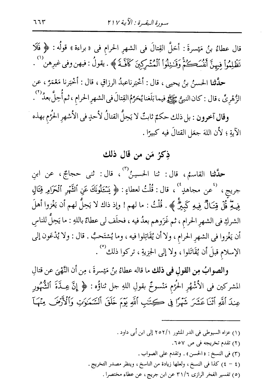 حَدَّثَنَا الْحَسَنُ بْنُ يَحْيَى، قَالَ: أَخْبَرَنَا عَبْدُ الرَّزَّاقِ، قَالَ: أَخْبَرَنَا مَعْمَرٌ، عَنِ الزُّهْرِيِّ، قَالَ: «§كَانَ النَّبِيُّ صَلَّى اللهُ عَلَيْهِ وَسَلَّمَ فِيمَا بَلَغَنَا يُحَرِّمُ الْقِتَالَ فِي الشَّهْرِ الْحَرَامِ، ثُمَّ أُحِلَّ بَعْدُ» وَقَالَ آخَرُونَ: بَلْ ذَلِكَ حُكْمٌ ثَابِتٌ لَا يَحِلُّ الْقِتَالُ لِأَحَدٍ فِي الْأَشْهُرِ الْحُرُمِ بِهَذِهِ الْآيَةِ، لِأَنَّ اللَّهَ جَعَلَ الْقِتَالَ فِيهِ كَبِيرًا
