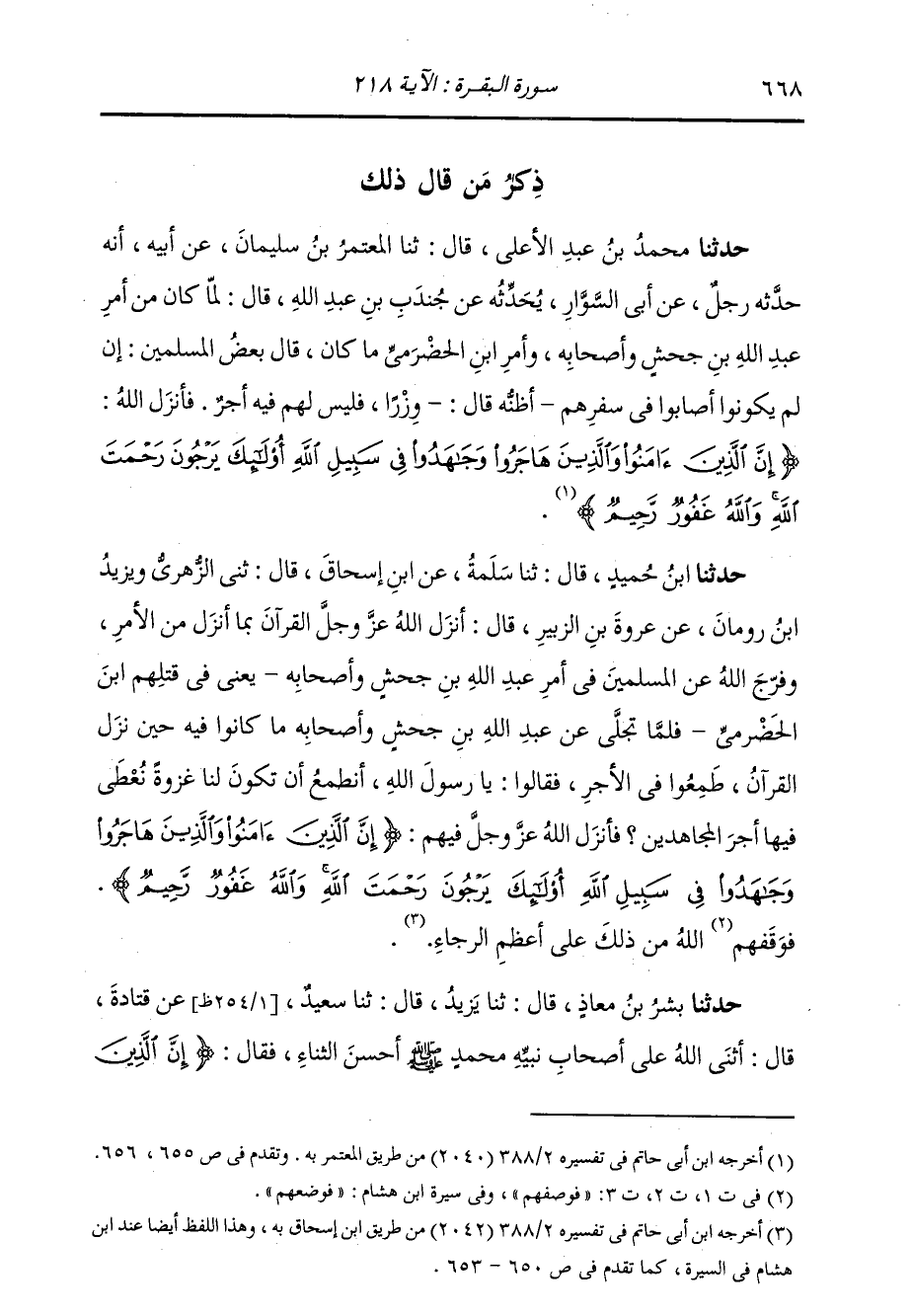 ذِكْرُ مَنْ قَالَ ذَلِكَ حَدَّثَنَا مُحَمَّدُ بْنُ عَبْدِ الْأَعْلَى، قَالَ: ثنا الْمُعْتَمِرُ بْنُ سُلَيْمَانَ، عَنْ أَبِيهِ، أَنَّهُ حَدَّثَهُ رَجُلٌ، عَنْ أَبِي السَّوَّارِ، يُحَدِّثُهُ، عَنْ جُنْدُبِ بْنِ عَبْدِ اللَّهِ، قَالَ: " لَمَّا كَانَ مِنْ أَمْرِ عَبْدِ اللَّهِ بْنِ جَحْشٍ، وَأَصْحَابِهِ، وَأَمْرِ ابْنِ الْحَضْرَمِيِّ مَا كَانَ قَالَ بَعْضُ الْمُسْلِمِينَ إِنْ لَمْ يَكُونُوا أَصَابُوا فِي سَفَرِهِمْ، أَظُنُّهُ قَالَ: وِزْرًا، فَلَيْسَ لَهُمْ فِيهِ أَجْرٌ، فَأَنْزَلَ اللَّهُ: {§إِنَّ الَّذِينَ آمَنُوا وَالَّذِينَ هَاجَرُوا وَجَاهِدُوا فِي سَبِيلِ اللَّهِ أُولَئِكَ يَرْجُونَ رَحْمَةَ اللَّهِ وَاللَّهُ غَفُورٌ رَحِيمٌ} "
