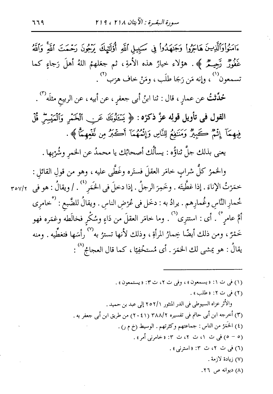 §الْقَوْلُ فِي تَأْوِيلِ قَوْلِهِ تَعَالَى: {يَسْأَلُونَكَ عَنِ الْخَمْرِ وَالْمَيْسِرِ قُلْ فِيهِمَا إِثْمٌ كَبِيرٌ وَمَنَافِعُ لِلنَّاسِ وَإِثْمُهُمَا أَكْبَرُ مِنْ نَفْعِهِمَا وَيَسْأَلُونَكَ مَاذَا يُنفِقُونَ قُلِ الْعَفْوَ كَذَلِكَ يُبيِّنُ اللَّهُ لَكُمُ الْآيَاتِ لَعَلَّكُمْ تَتَفَكَّرُونَ فِي الدُّنْيَا وَالآَخِرَةِ وَيَسْأَلُونَكَ عَنِ الْيَتَامَى قُلْ إِصْلاَحٌ لَّهُمْ خَيْرٌ وَإِنْ تُخَالِطُوهُمْ فَإِخْوَانُكُمْ وَاللَّهُ يَعْلَمُ الْمُفْسِدَ مِنَ الْمُصْلِحِ وَلَوْ شَاءَ اللَّهُ لأَعْنَتَكُمْ إِنَّ اللَّهَ عَزِيزٌ حَكِيمٌ} [البقرة: 220] يَعْنِي بِذَلِكَ جَلَّ ثَنَاؤُهُ: يَسْأَلُكَ أَصْحَابُكَ يَا مُحَمَّدُ عَنِ الْخَمْرِ وَشُرْبِهَا. وَالْخَمْرُ: كُلُّ شَرَابٍ خَامَرَ الْعَقْلَ فَسَتَرَهُ وَغَطَّى عَلَيْهِ، وَهُوَ مِنْ قَوْلِ الْقَائِلِ: خَمَّرْتَ الْإِنَاءَ إِذَا غَطَّيْتُهُ، وَخَمَّرَ الرَّجُلُ: إِذَا دَخَلَ فِي الْخَمْرِ، وَيُقَالُ هُوَ فِي خِمَارِ النَّاسِ، وَغِمَارِهِمْ، يُرَادُ بِهِ: دَخَلَ فِي عِرْضِ النَّاسِ، وَيُقَالُ لِلضَّبُعِ خَامِرِي أُمَّ عَامِرٍ، أَيِ اسْتَتِرِي. وَمَا خَامَرَ الْعَقْلَ مِنْ دَاءٍ وَسُكْرٍ فَخَالَطَهُ وَغَمَرَهُ فَهُوَ خَمْرٌ، وَمَنْ ذَلِكَ أَيْضًا خِمَارُ الْمَرْأَةِ؛ وَذَلِكَ لِأَنَّهَا تَسْتُرُ بِهِ رَأْسَهَا فَتُغَطِّيهِ، وَمِنْهُ يُقَالُ: هُوَ يَمْشِي لَكَ الْخَمَرَ، أَيْ مُسْتَخْفِيًا. كَمَا قَالَ الْعَجَّاجُ: