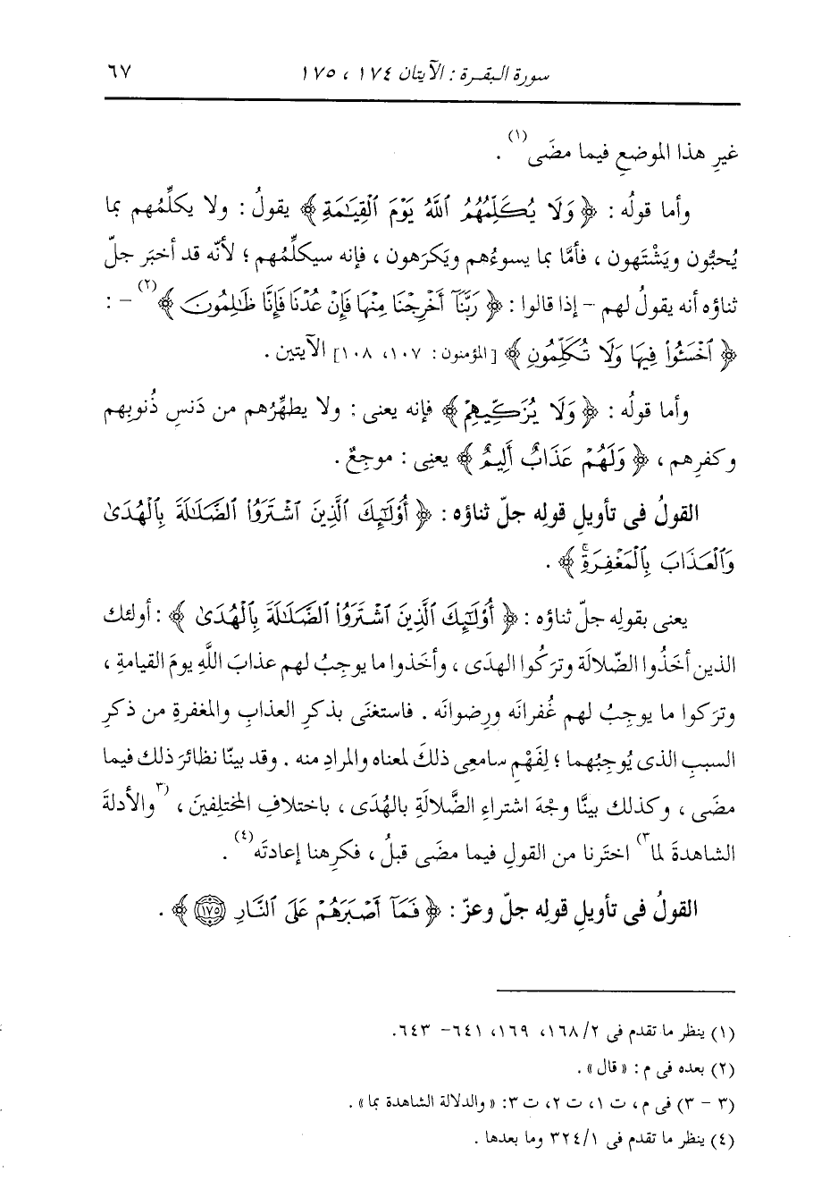 §وَأَمَّا قَوْلُهُ: {وَلَا يُكَلِّمُهُمُ اللَّهُ يَوْمَ الْقِيَامَةِ} [البقرة: 174] يَقُولُ: وَلَا يُكَلِّمُهُمْ بِمَا يُحِبُّونَ، وَيَشْتَهُونَ، فَأَمَّا بِمَا يَسُوءُهُمْ، وَيَكْرَهُونَ فَإِنَّهُ سَيُكَلِّمُهُمْ؛ لِأَنَّهُ قَدْ أَخْبَرَ تَعَالَى ذِكْرُهُ أَنَّهُ يَقُولُ لَهُمْ إِذَا قَالُوا: {رَبَّنَا أَخْرِجْنَا مِنْهَا فَإِنْ عُدْنَا فَإِنَّا ظَالِمُونَ} [المؤمنون: 107] قَالَ: {اخْسَئُوا فِيهَا وَلَا تَكَلَّمُونَ} لِآيَتَيْنِ.