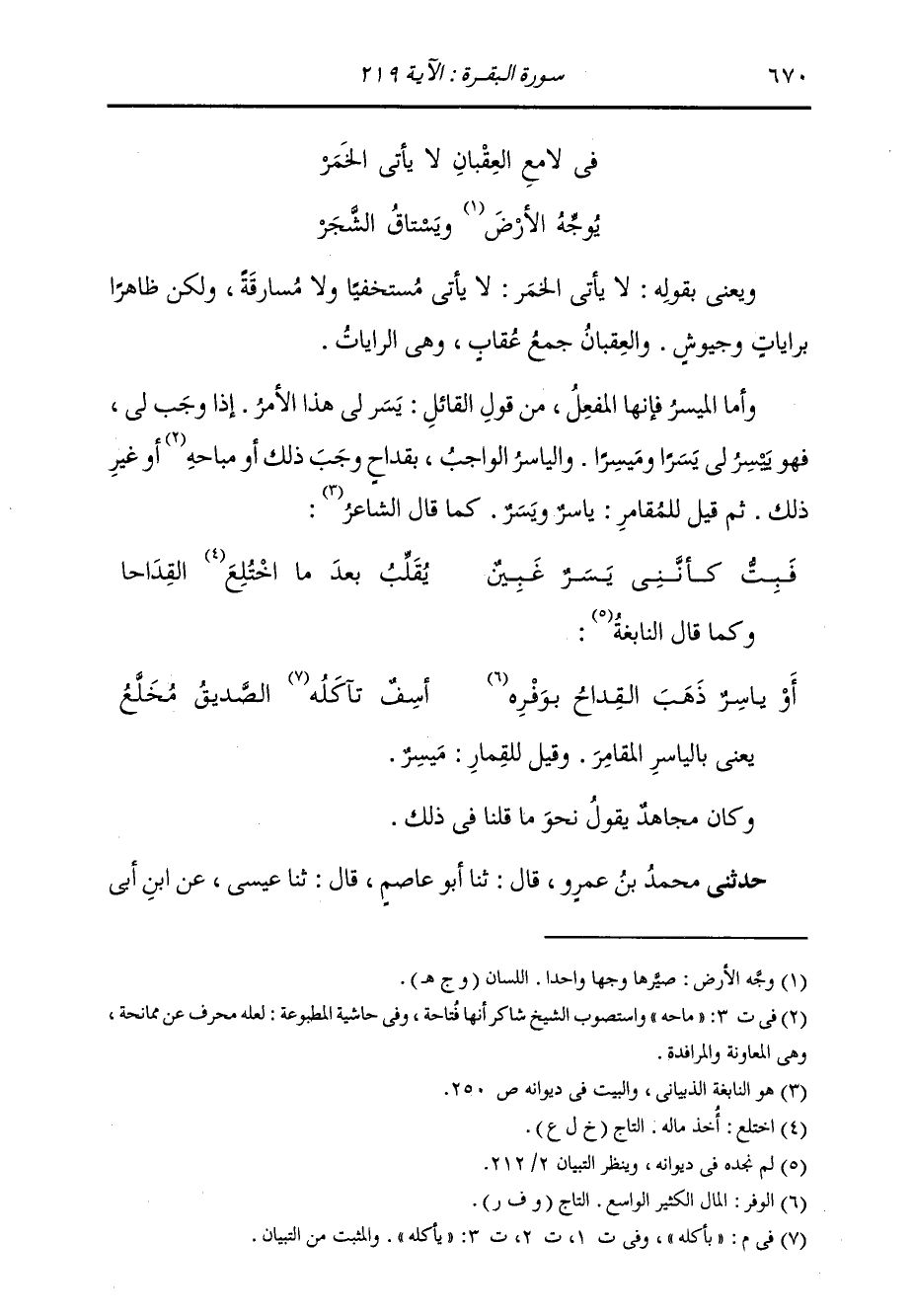 حَدَّثَنِي مُحَمَّدُ بْنُ عَمْرٍو، قَالَ: ثنا أَبُو عَاصِمٍ، قَالَ: ثنا عِيسَى، عَنِ ابْنِ أَبِي -[671]- نَجِيحٍ، عَنْ مُجَاهِدٍ، فِي قَوْلِهِ: " {§يَسْأَلُونَكَ عَنِ الْخَمْرِ وَالْمَيْسِرِ} [البقرة: 219] ، قَالَ: الْقِمَارُ، وَإِنَّمَا سُمِّيَ الْمَيْسِرُ لِقَوْلِهِمْ أَيْسَرُوا، وَاجْزِرُوا، كَقَوْلِكَ ضَعْ كَذَا وَكَذَا "