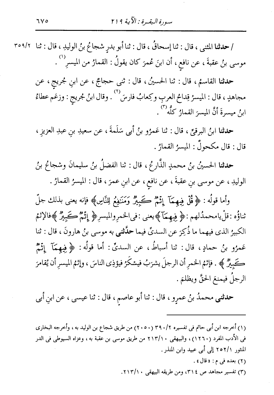 فِيمَا حَدَّثَنِي بِهِ مُوسَى بْنُ هَارُونَ، قَالَ: ثنا عَمْرُو بْنُ حَمَّادٍ، قَالَ: ثنا أَسْبَاطٌ، عَنِ السُّدِّيِّ: أَمَا قَوْلُهُ: " {§فِيهِمَا إِثْمٌ كَبِيرٌ} [البقرة: 219] فَإِثْمُ الْخَمْرِ أَنَّ الرَّجُلَ يَشْرَبُ فَيَسْكَرُ فَيُؤْذِي النَّاسَ. وَإِثْمُ الْمَيْسِرِ أَنْ يُقَامِرَ الرَّجُلُ فَيَمْنَعَ الْحَقَّ، وَيَظْلِمَ "