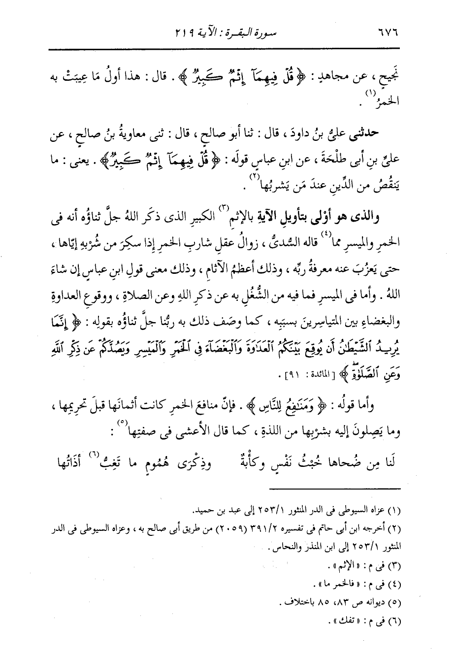 حَدَّثَنِي عَلِيُّ بْنُ دَاوُدَ، قَالَ: ثنا أَبُو صَالِحٍ، قَالَ: ثني مُعَاوِيَةُ بْنُ صَالِحٍ، عَنْ عَلِيِّ بْنِ أَبِي طَلْحَةَ، عَنِ ابْنِ عَبَّاسٍ، قَوْلَهُ: " {§قُلْ فِيهِمَا إِثْمٌ كَبِيرٌ} [البقرة: 219] يَعْنِي مَا يَنْقُصُ مِنَ الدِّينِ عِنْدَ مَنْ يَشْرَبُهَا " وَالَّذِي هُوَ أَوْلَى بِتَأْوِيلِ الْآيَةِ، الْإِثْمُ الْكَبِيرُ الَّذِي ذَكَرَ اللَّهُ جَلَّ ثَنَاؤُهُ أَنَّهُ فِي الْخَمْرِ، وَالْمَيْسِرِ، فَالْخَمْرُ مَا قَالَهُ السُّدِّيُّ: زَوَالُ عَقْلِ شَارِبِ الْخَمْرِ إِذَا سَكِرَ مِنْ شُرْبِهِ إِيَّاهَا حَتَّى يَعْزُبَ عَنْهُ مَعْرِفَةُ رَبِّهِ، وَذَلِكَ أَعْظَمُ الْآثَامِ، وَذَلِكَ مَعْنَى قَوْلِ ابْنِ عَبَّاسٍ إِنْ شَاءَ اللَّهُ. وَأَمَّا فِي الْمَيْسِرِ فَمَا فِيهِ مِنَ الشُّغْلِ بِهِ عَنْ ذِكْرِ اللَّهِ، وَعَنِ الصَّلَاةِ، وَوُقُوعِ الْعَدَاوَةِ وَالْبَغْضَاءِ بَيْنَ الْمُتَيَاسِرَيْنِ بِسَبَبِهِ، كَمَا وَصَفَ ذَلِكَ بِهِ رَبُّنَا جَلَّ ثَنَاؤُهُ بِقَوْلِهِ: {إِنَّمَا يُرِيدُ الشَّيْطَانُ أَنْ يُوقِعَ بَيْنَكُمُ الْعَدَاوَةَ وَالْبَغْضَاءَ فِي الْخَمْرِ وَالْمَيْسِرِ وَيَصُدَّكُمْ عَنْ ذِكْرِ اللَّهِ وَعَنِ الصَّلَاةِ} [المائدة: 91]