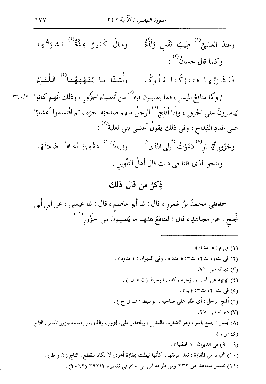 ذِكْرُ مَنْ قَالَ ذَلِكَ حَدَّثَنِي مُحَمَّدُ بْنُ عَمْرٍو، قَالَ: ثنا أَبُو عَاصِمٍ، قَالَ: ثنا عِيسَى، عَنِ ابْنِ أَبِي نَجِيحٍ، عَنْ مُجَاهِدٍ، قَالَ: «§الْمَنَافِعُ هَاهُنَا مَا يُصِيبُونَ مِنَ الْجَزُورِ»