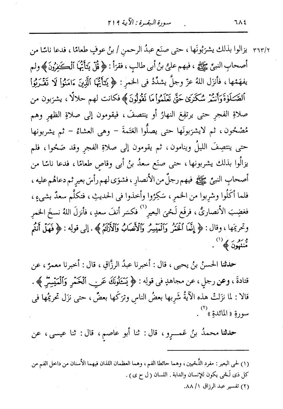 حَدَّثَنَا الْحَسَنُ بْنُ يَحْيَى، قَالَ: أَخْبَرَنَا عَبْدُ الرَّزَّاقِ، قَالَ: أَخْبَرَنَا مَعْمَرٌ، عَنْ قَتَادَةَ، وَعَنْ رَجُلٍ، عَنْ مُجَاهِدٍ، فِي قَوْلِهِ: " {§يَسْأَلُونَكَ عَنِ الْخَمْرِ، وَالْمَيْسِرِ،} [البقرة: 219] قَالَ: لَمَّا نَزَلَتْ هَذِهِ الْآيَةُ شَرِبَهَا بَعْضُ النَّاسِ وَتَرَكَهَا بَعْضٌ، حَتَّى نَزَلَ تَحْرِيمُهَا فِي سُورَةِ الْمَائِدَةِ "