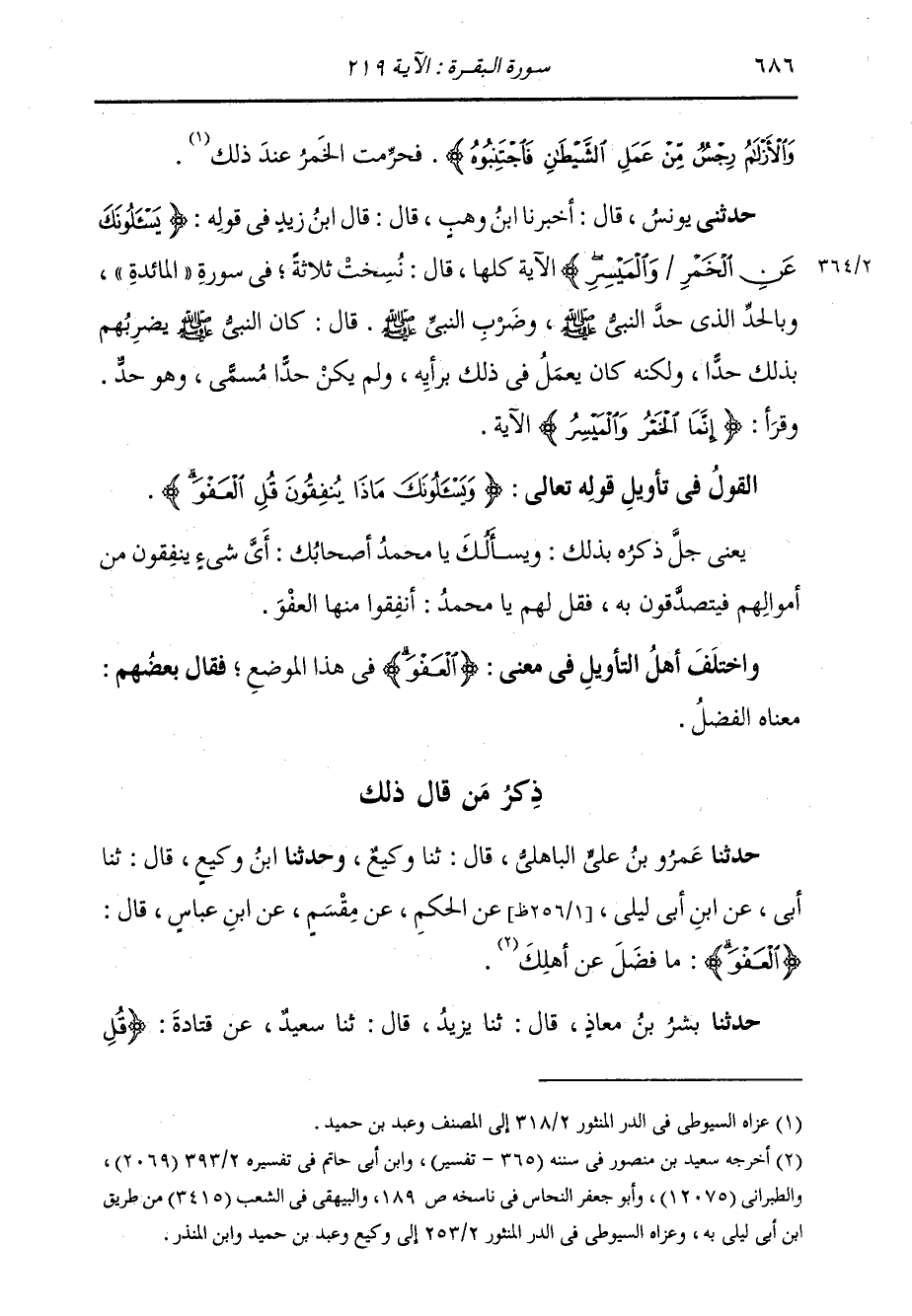 §الْقَوْلُ فِي تَأْوِيلِ قَوْلِهِ تَعَالَى: {وَيَسْأَلُونَكَ مَاذَا يُنْفِقُونَ قُلِ الْعَفْوَ} [البقرة: 219] يَعْنِي جَلَّ ذِكْرُهُ بِذَلِكَ: وَيَسْأَلُكَ يَا مُحَمَّدُ أَصْحَابُكَ: أَيُّ شَيْءٍ يُنْفِقُونَ مِنْ أَمْوَالِهِمْ فَيَتَصَدَّقُونَ بِهِ، فَقُلْ لَهُمْ يَا مُحَمَّدُ أَنْفِقُوا مِنْهَا الْعَفْوَ. وَاخْتَلَفَ أَهْلُ التَّأْوِيلِ فِي مَعْنَى: {الْعَفْوَ} [البقرة: 219] فِي هَذَا الْمَوْضِعِ، فَقَالَ بَعْضُهُمْ. مَعْنَاهُ: الْفَضْلُ