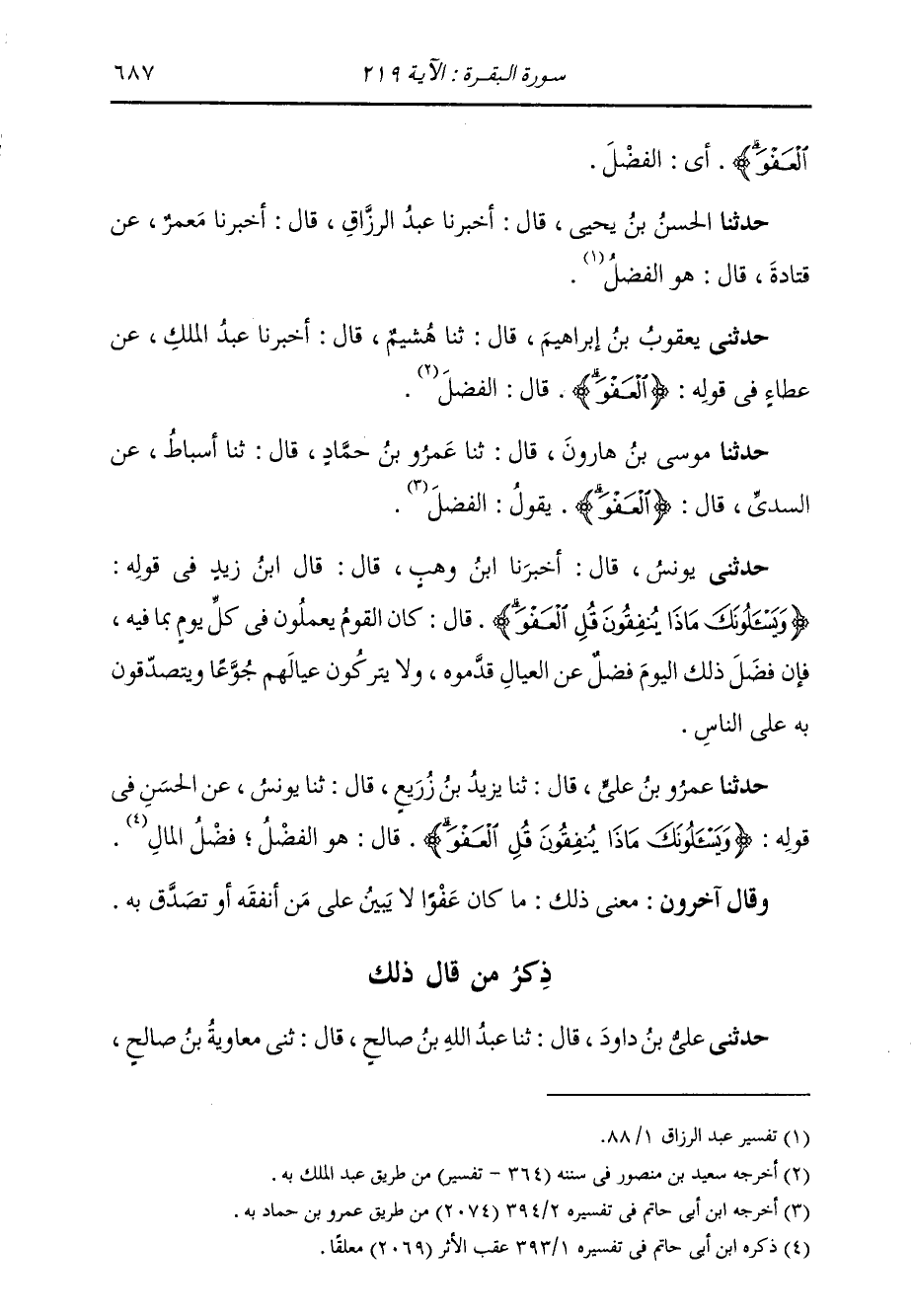 حَدَّثَنَا عَمْرُو بْنُ عَلِيٍّ، قَالَ: ثنا يَزِيدُ بْنُ زُرَيْعٍ، قَالَ: ثنا يُونُسُ، عَنِ الْحَسَنِ، فِي قَوْلِهِ: " {§وَيَسْأَلُونَكَ مَاذَا يُنْفِقُونَ قُلِ الْعَفْوَ} [البقرة: 219] قَالَ: هُوَ الْفَضْلُ فَضْلُ الْمَالِ " وَقَالَ آخَرُونَ: مَعْنَى ذَلِكَ مَا كَانَ عَفْوًا لَا يَبِينُ عَلَى مَنْ أَنْفَقَهُ أَوْ تَصَدَّقَ بِهِ