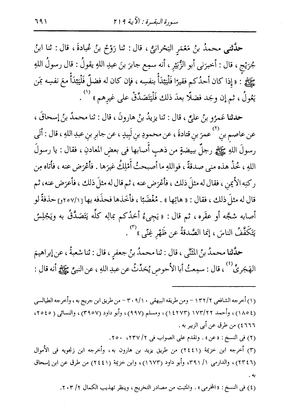 حَدَّثَنَا مُحَمَّدُ بْنُ الْمُثَنَّى قَالَ: ثنا مُحَمَّدُ بْنُ جَعْفَرٍ قَالَ: ثنا شُعْبَةُ، عَنْ إِبْرَاهِيمَ الْهَجَرِيِّ قَالَ: سَمِعْتُ أَبَا الْأَحْوَصِ يُحَدِّثُ عَنْ عَبْدِ اللَّهِ، عَنِ النَّبِيِّ صَلَّى اللهُ عَلَيْهِ وَسَلَّمَ أَنَّهُ قَالَ: «-[692]- ارْضَخْ مِنَ الْفَضْلِ، §وَابْدَأْ بِمَنْ تَعُولُ، وَلَا تُلَامُ عَلَى كَفَافٍ» وَمَا أَشْبَهَ ذَلِكَ مِنَ الْأَخْبَارِ الَّتِي يَطُولُ بِاسْتِقْصَاءِ ذِكْرِهَا الْكِتَابُ. فَإِذَا كَانَ الَّذِي أَذِنَ صَلَّى اللهُ عَلَيْهِ وَسَلَّمَ لِأُمَّتِهِ الصَّدَقَةَ مِنْ أَمْوَالِهِمْ بِالْفَضْلِ عَنْ حَاجَةِ الْمُتَصَدِّقِ الْفَضْلَ مِنْ ذَلِكَ، هُوَ الْعَفْوُ مِنْ مَالِ الرَّجُلِ؛ إِذْ كَانَ الْعَفْوُ فِي كَلَامِ الْعَرَبِ فِي الْمَالِ وَفِي كُلِّ شَيْءٍ هُوَ الزِّيَادَةُ وَالْكَثْرَةُ، وَمَنْ ذَلِكَ قَوْلُهُ جَلَّ ثَنَاؤُهُ: {حَتَّى عَفَوْا} [الأعراف: 95] بِمَعْنَى: زَادُوا عَلَى مَا كَانُوا عَلَيْهِ مِنَ الْعَدَدِ وَكَثُرُوا، وَمِنْهُ قَوْلُ الشَّاعِرِ: