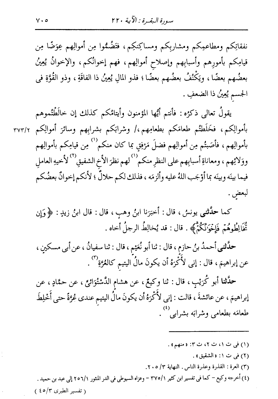 حَدَّثَنَا أَبُو كُرَيْبٍ، قَالَ: ثنا وَكِيعٌ، عَنْ هِشَامٍ الدَّسْتُوَائِيِّ، عَنْ حَمَّادٍ، عَنْ إِبْرَاهِيمَ، عَنْ عَائِشَةَ، قَالَتْ: «إِنَّى §لَأَكْرَهُ أَنْ يَكُونَ مَالُ الْيُتْمِ عِنْدِي عَلَى حِدَةٍ، حَتَّى أَخْلِطَ طَعَامَهُ بِطَعَامِي، وَشَرَابَهُ بِشَرَابِي» -[706]- فَإِنْ قَالَ لَنَا قَائِلٌ: وَكَيْفَ قَالَ {فَإِخْوَانُكُمْ} [البقرة: 220] فَرَفَعَ الْإِخْوَانَ، وَقَالَ فِي مَوْضِعٍ آخَرَ: {فَإِنْ خِفْتُمْ فَرِجَالًا أَوْ رُكْبَانًا} [البقرة: 239] . قِيلَ: لِافْتِرَاقِ مَعْنَيَيْهِمَا، وَذَلِكَ أَنَّ أَيْتَامَ الْمُؤْمِنِينَ إِخْوَانُ الْمُؤْمِنِينَ، خَالَطَهُمُ الْمُؤْمِنُونَ بِأَمْوَالِهِمْ أَوْ لَمْ يُخَالِطُوهُمْ. فَمَعْنَى الْكَلَامِ: وَإِنْ تُخَالِطُوهُمْ فَهُمْ إِخْوَانُكُمْ. وَالْإِخْوَانُ مَرْفُوعُونَ بِالْمَعْنَى الْمَتْرُوكِ ذِكْرُهُ وَهُوَ هُمْ لِدَلَالَةِ الْكَلَامِ عَلَيْهِ، وَإِنَّهُ لَمْ يُرِدْ بِالْإِخْوَانِ الْخَبَرَ عَنْهُمْ أَنَّهُمْ كَانُوا إِخْوَانًا مِنْ أَجْلِ مُخَالَطَةِ وُلَاتِهِمْ إِيَّاهُمْ. وَلَوْ كَانَ ذَلِكَ الْمُرَادَ لَكَانَتِ الْقِرَاءَةُ نَصْبًا، وَكَانَ مَعْنَاهُ حِينَئِذٍ وَإِنْ تُخَالِطُوهُمْ فَخَالِطُوا إِخْوَانَكُمْ، وَلَكِنَّهُ قُرِئَ رَفْعًا لِمَا وَصَفْتُ مِنْ أَنَّهُمْ إِخْوَانٌ لِلْمُؤْمِنِينَ الَّذِينَ يَلُونَهُمْ خَالَطُوهُمْ أَوْ لَمْ يُخَالِطُوهُمْ. وَأَمَّا قَوْلُهُ: {فَرِجَالًا أَوْ رُكْبَانًا} [البقرة: 239] فَنَصْبٌ لِأَنَّهُمَا حَالَانِ لِلْفِعْلِ غَيْرُ دَائِبَيْنِ، وَلَا يَصْلُحُ مَعَهُمَا هُوَ، وَذَلِكَ أَنَّكَ لَوْ أَظْهَرْتَ هُوَ مَعَهُمَا لَاسْتَحَالَ الْكَلَامُ. أَلَا تَرَى أَنَّهُ لَوْ قَالَ قَائِلٌ: إِنْ خِفْتَ مِنْ عَدُوِّكَ أَنْ تُصَلِّيَ قَائِمًا، فَهُوَ رَاجِلٌ أَوْ رَاكِبٌ لَبَطَلَ الْمَعْنَى الْمُرَادُ بِالْكَلَامِ؟ وَذَلِكَ أَنْ تَأْوِيلَ الْكَلَامِ: فَإِنْ خِفْتُمْ أَنْ تُصَلُّوا قِيَامًا مِنْ عَدُوِّكُمْ، فَصَلُّوا رِجَالًا أَوْ رُكْبَانًا؛ وَلِذَلِكَ نَصَبَهُ إِجْرَاءً عَلَى مَا قَبْلَهُ مِنَ الْكَلَامِ كَمَا تَقُولُ فِي نَحْوِهِ مِنَ الْكَلَامِ: إِنْ لَبِسْتَ ثِيَابًا فَالْبَيَاضَ، فَتَنْصِبُهُ لِأَنَّكَ تُرِيدُ إِنْ لَبِسْتَ ثِيَابًا فَالْبَسِ الْبَيَاضَ، وَلَسْتَ تُرِيدُ الْخَبَرَ عَنْ أَنَّ جَمِيعَ مَا يُلْبَسُ مِنَ الثِّيَابِ فَهُوَ الْبَيَاضُ، وَلَوْ أَرَدْتَ الْخَبَرَ عَنْ ذَلِكَ لَقُلْتَ: إِنْ لَبِسْتَ ثِيَابًا فَالْبَيَاضَ رَفْعًا، إِذْ كَانَ مَخْرَجُ الْكَلَامِ عَلَى وَجْهِ الْخَبَرِ مِنْكَ عَنِ اللَّابِسِ أَنَّ كُلَّ مَا -[707]- يُلْبَسُ مِنَ الثِّيَابِ فَبَيَاضٌ، لِأَنَّكَ تُرِيدُ حِينَئِذٍ: إِنْ لَبِسْتَ ثِيَابًا فَهِيَ بَيَاضٌ. فَإِنْ قَالَ: فَهَلْ يَجُوزُ النَّصْبُ فِي قَوْلِهِ: {فَإِخْوَانُكُمْ} [البقرة: 220] ؟ قِيلَ: جَائِزٌ فِي الْعَرَبِيَّةِ، فَأَمَّا فِي الْقِرَاءَةِ فَإِنَّمَا مَنَعْنَاهُ لِإِجْمَاعِ الْقُرَّاءِ عَلَى رَفْعِهِ. وَأَمَّا فِي الْعَرَبِيَّةِ فَإِنَّمَا أَجَزْنَاهُ لِأَنَّهُ يَحْسُنُ مَعَهُ تَكْرِيرُ مَا يُحْمَلُ فِي الَّذِي قَبْلَهُ مِنَ الْفِعْلِ فِيهِمَا: وَإِنْ تُخَالِطُوهُمْ فَإِخْوَانُكُمْ تُخَالِطُونَ؛ فَيَكُونُ ذَلِكَ جَائِزًا فِي كَلَامِ الْعَرَبِ