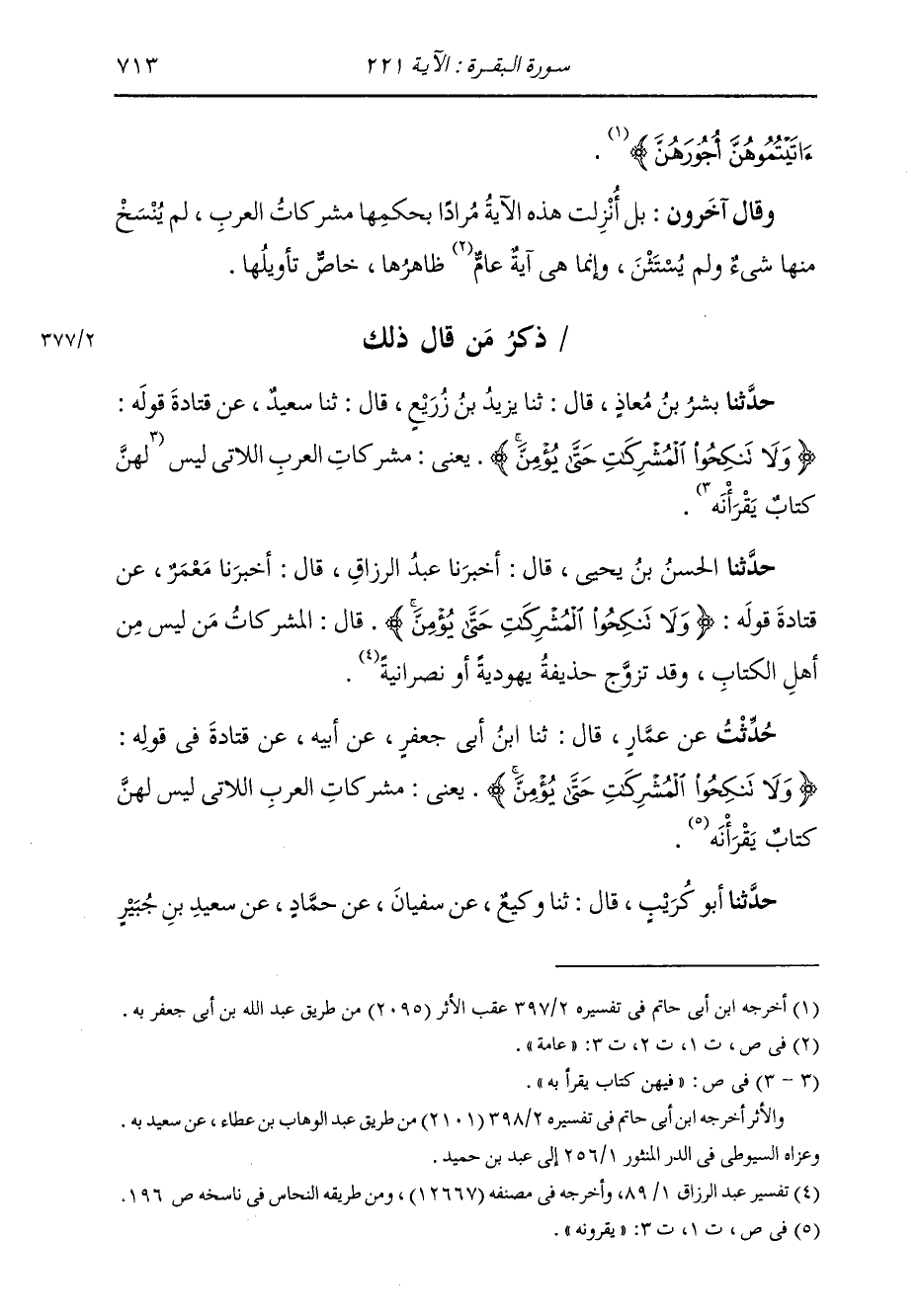 حَدَّثَنَا أَبُو كُرَيْبٍ، قَالَ: ثنا وَكِيعٌ، عَنْ سُفْيَانَ، عَنْ حَمَّادٍ، عَنْ سَعِيدِ بْنِ جُبَيْرٍ، -[714]- قَوْلَهُ: " {§وَلَا تَنْكِحُوا الْمُشْرِكَاتِ حَتَّى يُؤْمِنَّ} [البقرة: 221] قَالَ: مُشْرِكَاتُ أَهْلِ الْأَوْثَانِ " وَقَالَ آخَرُونَ: بَلْ أُنْزِلَتْ هَذِهِ الْآيَةُ مُرَادًا بِهَا كُلُّ مُشْرِكَةٍ مِنْ أَيِّ أَصْنَافِ الشِّرْكِ كَانَتْ غَيْرَ مَخْصُوصٍ مِنْهَا مُشْرِكَةٌ دُونَ مُشْرِكَةٍ، وَثَنِيَّةً كَانَتْ، أَوْ مَجُوسِيَّةً، أَوْ كِتَابِيَّةً، وَلَا نُسِخَ مِنْهَا شَيْءٌ