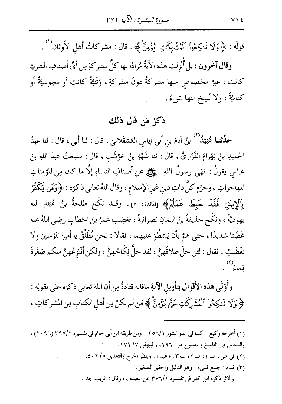 ذِكْرُ مَنْ قَالَ ذَلِكَ حَدَّثَنَا عُبَيْدُ بْنُ آدَمَ بْنِ أَبِي إِيَاسٍ الْعَسْقَلَانِيُّ، قَالَ: ثنا أَبِي قَالَ: ثنا عَبْدُ الْحَمِيدِ بْنُ بَهْرَامَ الْفَزَارِيُّ، قَالَ: ثنا شَهْرُ بْنُ حَوْشَبٍ، قَالَ: سَمِعْتُ عَبْدَ اللَّهِ بْنَ عَبَّاسٍ، يَقُولُ: " نَهَى رَسُولُ اللَّهِ صَلَّى اللهُ عَلَيْهِ وَسَلَّمَ §عَنْ أَصْنَافِ النِّسَاءِ إِلَّا مَا كَانَ مِنَ الْمُؤْمِنَاتِ الْمُهَاجِرَاتِ، وَحَرَّمَ كُلَّ ذَاتِ دِينٍ غَيْرِ الْإِسْلَامِ، وَقَالَ اللَّهُ تَعَالَى ذِكْرُهُ: {وَمَنْ يَكْفُرْ بِالْإِيمَانِ فَقَدْ حَبِطَ عَمَلُهُ} [المائدة: 5] وَقَدْ نَكَحَ طَلْحَةُ بْنُ عُبَيْدِ اللَّهِ يَهُودِيَّةً، وَنَكَحَ حُذَيْفَةُ بْنُ الْيَمَانِ نَصْرَانِيَّةً فَغَضِبَ عُمَرُ بْنُ الْخَطَّابِ رَضِيَ اللَّهُ عَنْهُ غَضَبًا شَدِيدًا حَتَّى هَمَّ بِأَنْ يَسْطُوَ عَلَيْهِمَا، فَقَالَا: نَحْنُ نُطَلِّقُ يَا أَمِيرَ الْمُؤْمِنِينَ وَلَا تَغْضَبْ، فَقَالَ: «لَئِنْ حَلَّ طَلَاقُهُنَّ، لَقَدْ حَلَّ نِكَاحُهُنَّ، وَلَكِنْ أَنْتَزِعِهُنَّ مِنْكُمْ صِغَرَةً قِمَاءً» وَأَوْلَى هَذِهِ الْأَقْوَالِ بِتَأْوِيلِ الْآيَةِ مَا قَالَهُ قَتَادَةُ، مِنْ أَنِّ اللَّهَ تَعَالَى ذِكْرُهُ عَنَى بِقَوْلِهِ: {وَلَا تَنْكِحُوا الْمُشْرِكَاتِ حَتَّى يُؤْمِنَّ} [البقرة: 221] مَنْ لَمْ يَكُنْ مِنْ أَهْلِ الْكِتَابِ مِنَ الْمُشْرِكَاتِ، -[715]- وَأَنَّ الْآيَةَ عَامٌّ ظَاهِرُهَا خَاصٌّ بَاطِنُهَا، لَمْ يُنْسَخْ مِنْهَا شَيْءٌ، وَأَنَّ نِسَاءَ أَهْلِ الْكِتَابِ غَيْرُ دَاخِلَاتٍ فِيهَا. وَذَلِكَ أَنَّ اللَّهَ تَعَالَى ذِكْرُهُ أَحَلَّ بِقَوْلِهِ: {وَالْمُحْصَنَاتُ مِنَ الَّذِينَ أُوتُوا الْكِتَابَ مِنْ قَبْلِكُمْ} [المائدة: 5] لِلْمُؤْمِنِينَ مِنْ نِكَاحِ مُحْصَنَاتِهِنَّ، مِثْلَ الَّذِي أَبَاحَ لَهُمْ مِنْ نِسَاءِ الْمُؤْمِنَاتِ. وَقَدْ بَيَّنَا فِي غَيْرِ هَذَا الْمَوْضِعِ مِنْ كِتَابِنَا هَذَا، وَفِي كِتَابِنَا «كِتَابِ اللَّطِيفِ مِنَ الْبَيَانِ» أَنَّ كُلَّ آيَتَيْنِ أَوْ خَبَرَيْنِ كَانَ أَحَدُهُمَا نَافِيًا حُكْمَ الْآخَرِ فِي فِطْرَةِ الْعَقْلِ، فَغَيْرُ جَائِزٍ أَنْ يُقْضَى عَلَى أَحَدِهِمَا بِأَنَّهُ نَاسِخٌ حُكْمَ الْآخَرِ إِلَّا بِحُجَّةٍ مِنْ خَبَرٍ قَاطِعٍ لِلْعُذْرِ مَجِيئُهُ، وَذَلِكَ غَيْرُ مَوْجُودٍ أنَّ قَوْلَهُ: {وَالْمُحْصَنَاتُ مِنَ الَّذِينَ أُوتُوا الْكِتَابَ} [المائدة: 5] نَاسِخٌ مَا كَانَ قَدْ وَجَبَ تَحْرِيمُهُ مِنَ النِّسَاءِ بِقَوْلِهِ: {وَلَا تَنْكِحُوا الْمُشْرِكَاتِ حَتَّى يُؤْمِنَّ} [البقرة: 221] فَإِنُ لَمْ يَكُنْ ذَلِكَ مَوْجُودًا كَذَلِكَ، فَقَوْلُ الْقَائِلِ: «هَذِهِ نَاسِخَةٌ هَذِهِ» دَعْوَى لَا بُرْهَانَ لَهُ عَلَيْهَا، وَالْمُدَّعِي دَعْوَى لَا بُرْهَانَ لَهُ عَلَيْهَا مُتَحَكِّمٌ، وَالتَّحَكُّمُ لَا يَعْجِزُ عَنْهُ أَحَدٌ. وَأَمَّا الْقَوْلُ الَّذِي رُوِيَ عَنْ شَهْرِ بْنِ حَوْشَبٍ، عَنِ ابْنِ عَبَّاسٍ، عَنْ عُمَرَ رَضِيَ اللَّهُ عَنْهُ مِنْ تَفْرِيقِهِ بَيْنَ طَلْحَةَ، وَحُذَيْفَةَ وَامْرَأَتَيْهِمَا اللَّتَيْنِ كَانَتَا كِتَابِيِّتَيْنِ، فَقَوْلٌ لَا مَعْنَى لَهُ لِخِلَافِهِ مَا الْأُمَّةُ مُجْتَمِعَةٌ عَلَى تَحْلِيلِهِ بِكِتَابِ اللَّهِ تَعَالَى ذِكْرُهُ، وَخَبَرِ رَسُولِهِ صَلَّى اللهُ عَلَيْهِ وَسَلَّمَ. وَقَدْ رُوِيَ عَنْ عُمَرَ بْنِ الْخَطَّابِ رَضِيَ اللَّهُ عَنْهُ مِنَ الْقَوْلِ خِلَافُ ذَلِكَ بِإِسْنَادٍ هُوَ أَصَحُّ مِنْهُ