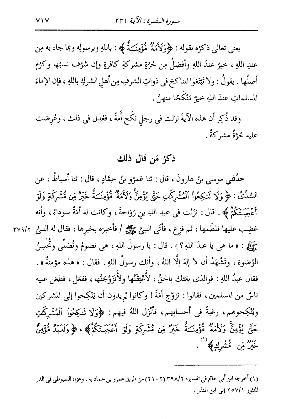 ذِكْرُ مَنْ قَالَ ذَلِكَ حَدَّثَنِي مُوسَى بْنُ هَارُونَ، قَالَ: ثنا عَمْرُو بْنُ حَمَّادٍ، قَالَ: ثنا أَسْبَاطٌ، عَنِ السُّدِّيِّ: " {§وَلَا تَنْكِحُوا الْمُشْرِكَاتِ حَتَّى يُؤْمِنَّ وَلَأَمَةٌ مُؤْمِنَةٌ خَيْرٌ مِنْ مُشْرِكَةٍ وَلَوْ أَعْجَبَتْكُمْ} [البقرة: 221] قَالَ: نَزَلَتْ فِي عَبْدِ اللَّهِ بْنِ رَوَاحَةَ، وَكَانَتْ لَهُ أَمَةٌ سَوْدَاءُ، وَأَنَّهُ غَضِبَ عَلَيْهَا فَلَطَمَهَا ثُمَّ فَزِعَ، فَأَتَى النَّبِيَّ صَلَّى اللهُ عَلَيْهِ وَسَلَّمَ فَأَخْبَرَهُ بِخَبَرِهَا، فَقَالَ لَهُ النَّبِيُّ صَلَّى اللهُ عَلَيْهِ وَسَلَّمَ: «مَا هِيَ يَا عَبْدَ اللَّهِ؟» قَالَ: يَا رَسُولَ اللَّهِ هِيَ تَصُومُ، وَتُصَلِّي، وَتُحْسِنُ الْوضُوءَ، وَتَشْهَدُ أَنْ لَا إِلَهَ إِلَّا اللَّهُ، وَأَنَّكَ رَسُولُ اللَّهِ. فَقَالَ: «هَذِهِ مُؤْمِنَةٌ» فَقَالَ عَبْدُ اللَّهِ: فَوَالَّذِي بَعَثَكَ بِالْحَقِّ لَأُعْتِقَنَّهَا، وَلَأَتَزَوَّجَنَّهَا فَفَعَلَ، فَطَعَنَ عَلَيْهِ نَاسٌ مِنَ الْمُسْلِمِينَ، فَقَالُوا: تَزَوَّجَ أَمَةً. وَكَانُوا يُرِيدُونَ أَنْ يُنْكِحُوا إِلَى الْمُشْرِكِينَ، وَيُنْكِحُوهُمْ رَغْبَةً فِي أَحْسَابِهِمْ. فَأَنْزَلَ اللَّهُ فِيهِمْ: {وَلَأَمَةٌ مُؤْمِنَةٌ خَيْرٌ مِنْ مُشْرِكَةٍ} [البقرة: 221] وَعَبْدٌ مُؤْمِنٌ خَيْرٌ مِنْ مُشْرِكٍ "