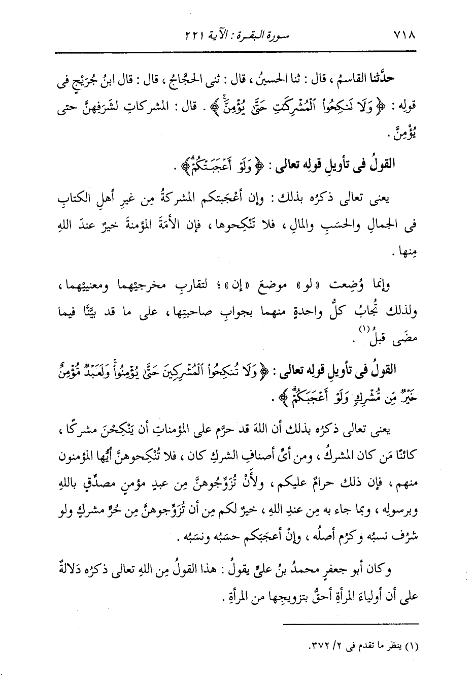 حَدَّثَنَا الْقَاسِمُ، قَالَ: ثنا الْحُسَيْنُ، قَالَ: ثني الْحَجَّاجٌ، قَالَ: قَالَ ابْنُ جُرَيْجٍ، فِي قَوْلِهِ: " {§وَلَا تَنْكِحُوا الْمُشْرِكَاتِ حَتَّى يُؤْمِنَّ} [البقرة: 221] قَالَ: الْمُشْرِكَاتُ لِشَرَفِهِنَّ حَتَّى يُؤْمِنَّ "