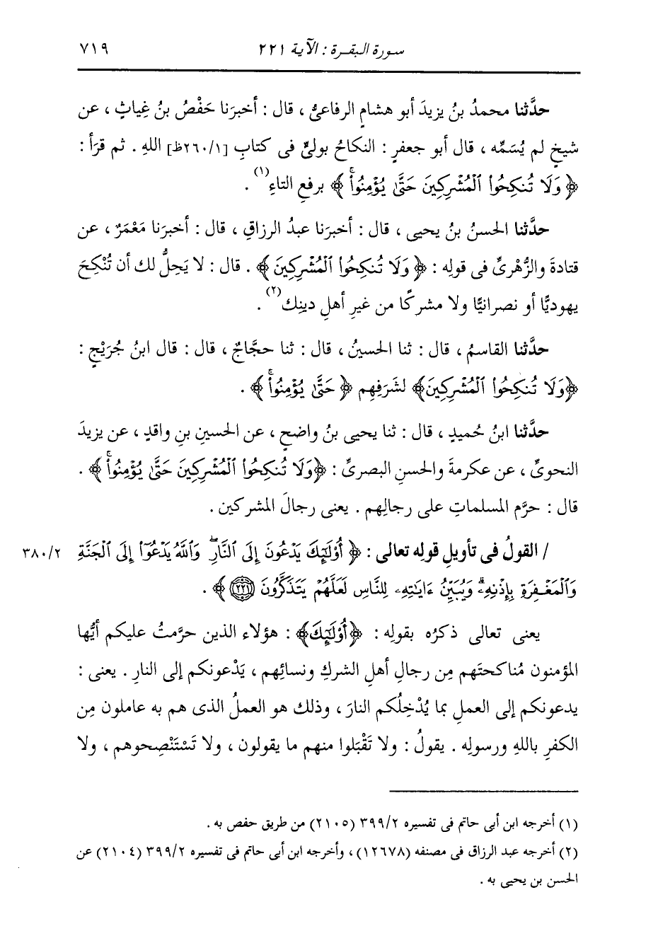 حَدَّثَنَا ابْنُ حُمَيْدٍ، قَالَ: ثنا يَحْيَى بْنُ وَاضِحٍ، عَنِ الْحُسَيْنِ بْنِ وَاقِدٍ، عَنْ يَزِيدَ النَّحْوِيِّ، عَنْ عِكْرِمَةَ، وَالْحَسَنِ الْبَصْرِيِّ: " {§وَلَا تُنْكِحُوا الْمُشْرِكِينَ حَتَّى يُؤْمِنُوا} [البقرة: 221] قَالَ: حَرَّمَ الْمُسْلِمَاتِ عَلَى رِجَالِهِمْ يَعْنِي رِجَالَ الْمُشْرِكِينَ "