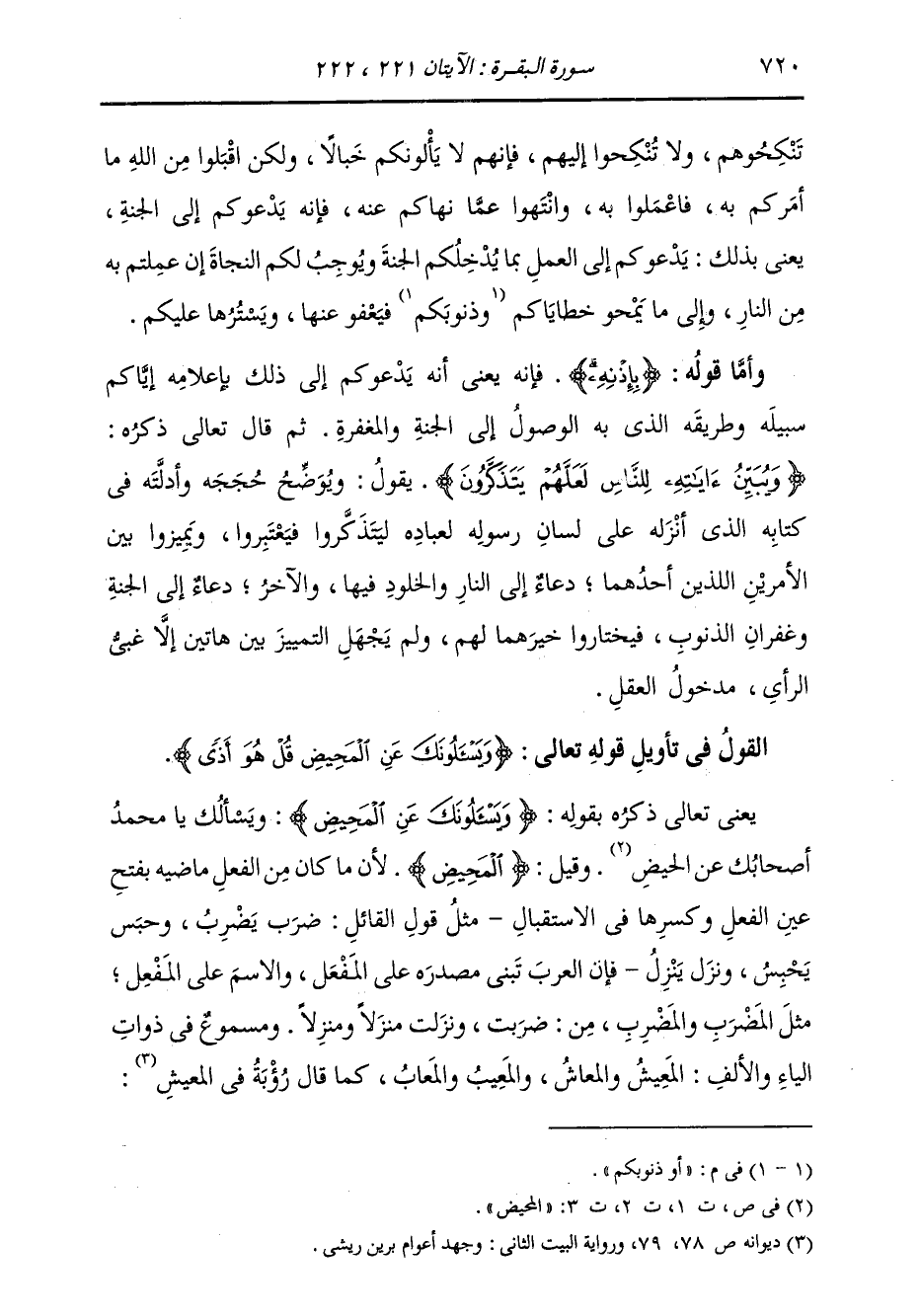 §يَعْنِي تَعَالَى ذِكْرُهُ بِقَوْلِهِ: {وَيَسْأَلُونَكَ عَنِ الْمَحِيضِ} [البقرة: 222] وَيَسْأَلُكَ يَا مُحَمَّدُ أَصْحَابُكَ عَنِ الْحَيْضِ وَقِيلَ «الْمَحِيضِ» لِأَنَّ مَا كَانَ مِنَ الْفِعْلِ مَاضِيهِ بِفَتْحِ عَيْنِ الْفِعْلِ وَكَسْرِهَا فِي الِاسْتِقْبَالِ، مِثْلَ قَوْلِ الْقَائِلِ: ضَرَبَ يَضْرِبُ، وَحَبَسَ يَحْبِسُ، وَنَزَلَ يَنْزِلُ، فَإِنَّ الْعَرَبَ تَبْنِي مَصْدَرَهُ عَلَى الْمَفْعِلِ، وَالِاسْمُ عَلَى الْمَفْعَلِ مِثْلَ الْمَضْرِبِ وَالْمَضْرَبِ مِنْ ضَرَبْتُ، وَنَزَلْتُ مَنْزِلًا وَمَنْزَلًا. وَمَسْمُوعٌ فِي ذَوَاتِ الْيَاءِ وَالْأَلِفِ الْمَعِيشِ وَالْمَعَاشِ وَالْمَعِيبِ وَالْمُعَابِ، كَمَا قَالَ رُؤْبَةُ فِي الْمَعِيشِ: