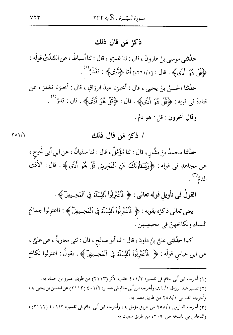 ذِكْرُ مَنْ قَالَ ذَلِكَ حَدَّثَنَا مُحَمَّدُ بْنُ بَشَّارٍ، قَالَ: ثنا مُؤَمَّلٌ، قَالَ: ثنا سُفْيَانُ، عَنِ ابْنِ أَبِي نَجِيحٍ، عَنْ مُجَاهِدٍ، فِي قَوْلِهِ: " {§وَيَسْأَلُونَكَ عَنِ الْمَحِيضِ قُلْ هُوَ أَذًى} [البقرة: 222] قَالَ: الْأَذَى: الدَّمُ "