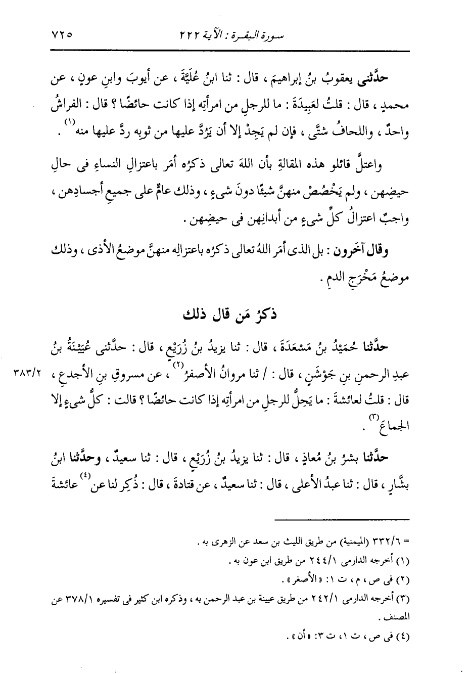 حَدَّثَنِي يَعْقُوبُ بْنُ إِبْرَاهِيمَ، قَالَ: ثنا ابْنُ عُلَيَّةَ، عَنْ أَيُّوبَ، وَابْنُ عَوْنٍ، عَنْ مُحَمَّدٍ، قَالَتْ لِعَبِيدَةَ، مَا لِلرَّجُلِ مِنَ امْرَأَتِهِ إِذَا كَانَتْ حَائِضًا؟ قَالَ: «§الْفِرَاشُ وَاحِدٌ، وَاللِّحَافُ شَتًّى، فَإِنْ لَمْ يَجِدْ إِلَّا أَنْ يَرُدَّ عَلَيْهَا مِنْ ثَوْبِهِ رَدَّ عَلَيْهَا مِنْهُ» وَاعْتَلَّ قَائِلُو هَذِهِ الْمَقَالَةِ بِأَنَّ اللَّهَ تَعَالَى ذِكْرُهُ أَمَرَ بِاعْتِزَالِ النِّسَاءِ فِي حَالِ حَيْضِهِنَّ، وَلَمْ يُخَصِّصْ مِنْهُنَّ شَيْئًا دُونَ شَيْءٍ، وَذَلِكَ عَامٌّ عَلَى جَمِيعِ أَجْسَادِهِنَّ وَاجِبٌ اعْتِزَالُ كُلِّ شَيْءٍ مِنْ أَبْدَانِهِنَّ فِي حَيْضِهِنَّ. وَقَالَ آخَرُونَ: بَلِ الَّذِي أَمَرَ اللَّهُ تَعَالَى ذِكْرُهُ بِاعْتِزَالِهِ مِنْهُنَّ مَوْضِعَ الْأَذَى، وَذَلِكَ مَوْضِعُ مَخْرَجِ الدَّمِ