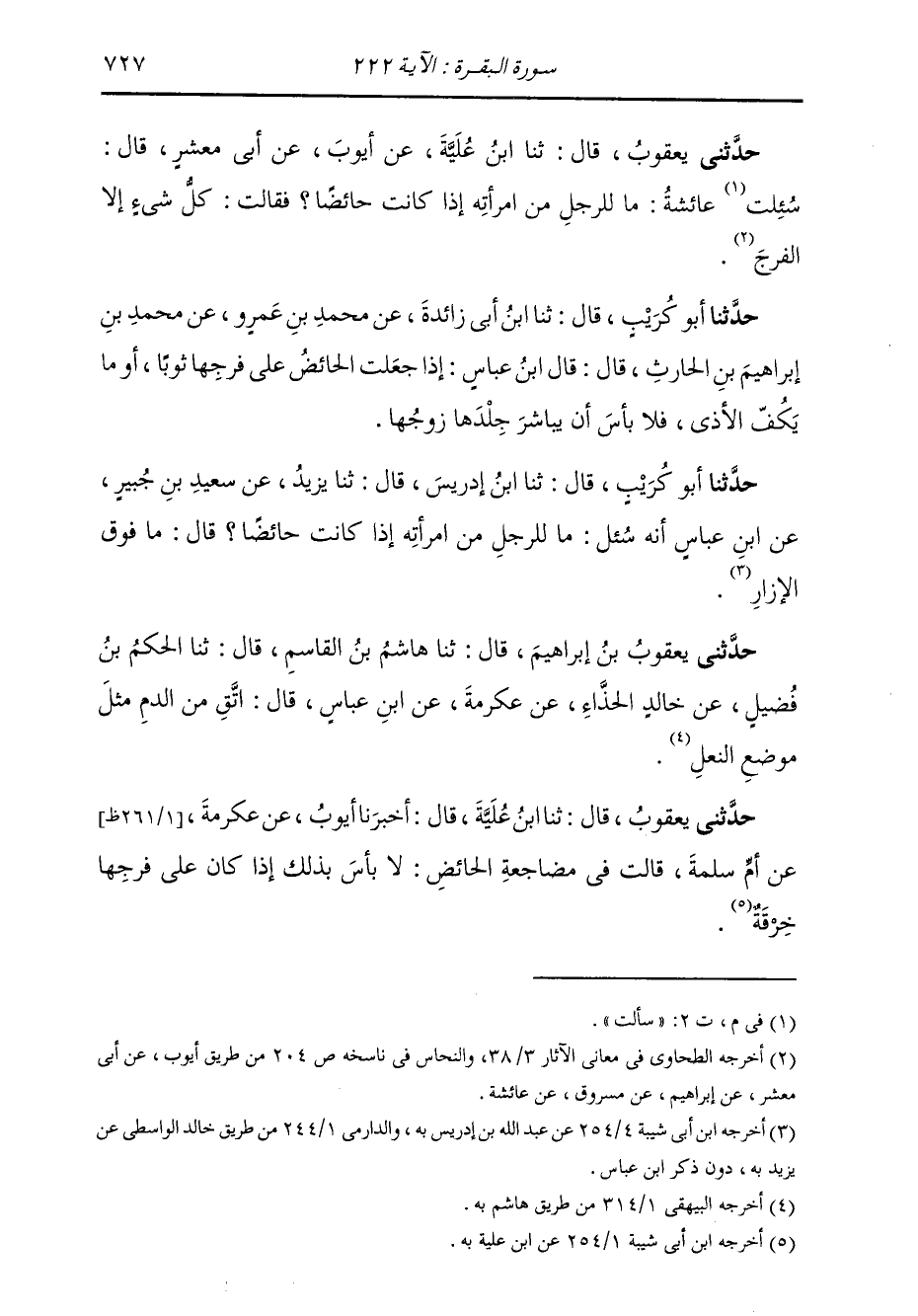 حَدَّثَنِي يَعْقُوبُ، قَالَ: ثنا ابْنُ عُلَيَّةَ، عَنْ أَيُّوبَ، عَنْ أَبِي مَعْشَرٍ، قَالَ: سَأَلْتُ عَائِشَةَ: " §مَا لِلرَّجُلِ مِنَ امْرَأَتِهِ إِذَا كَانَتْ حَائِضًا؟ فَقَالَتْ: كُلُّ شَيْءٍ إِلَّا الْفَرْجَ "