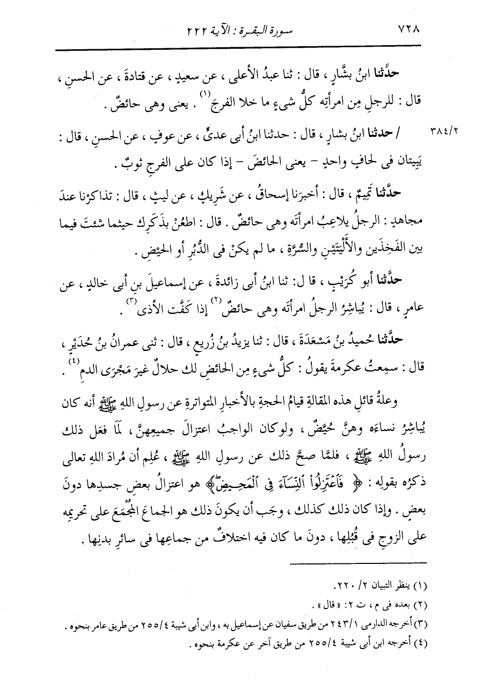 حَدَّثَنَا حُمَيْدُ بْنُ مَسْعَدَةَ، قَالَ: ثنا يَزِيدُ بْنُ زُرَيْعٍ، قَالَ: ثني عِمْرَانُ بْنُ حُدَيْرٍ، قَالَ: سَمِعْتُ عِكْرِمَةَ، يَقُولُ: «§كُلُّ شَيْءٍ مِنَ الْحَائِضِ لَكَ حَلَالٌ غَيْرَ مَجْرَى الدَّمِ» وَعِلَّةُ قَائِلِ هَذِهِ الْمَقَالَةِ، قِيَامُ الْحِجَّةِ بِالْأَخْبَارِ الْمُتَوَاتِرَةِ عَنْ رَسُولِ اللَّهِ صَلَّى اللهُ عَلَيْهِ وَسَلَّمَ أَنَّهُ «كَانَ يُبَاشِرُ نِسَاءَهُ وَهُنَّ حِيَضٌ» ، وَلَوْ كَانَ الْوَاجِبُ اعْتِزَالَ جَمِيعِهِنَّ لَمَا فَعَلَ ذَلِكَ رَسُولُ اللَّهِ صَلَّى اللهُ عَلَيْهِ وَسَلَّمَ، فَلَمَّا صَحَّ ذَلِكَ عَنْ رَسُولِ اللَّهِ صَلَّى اللهُ عَلَيْهِ وَسَلَّمَ، عَلِمَ أَنَّ مُرَادَ اللَّهِ تَعَالَى ذِكْرُهُ بِقَوْلِهِ: {فَاعْتَزِلُوا النِّسَاءَ فِي الْمَحِيضِ} [البقرة: 222] هُوَ اعْتِزَالُ بَعْضِ جَسَدِهَا دُونَ بَعْضٍ. وَإِذَا كَانَ ذَلِكَ كَذَلِكَ، وَجَبَ أَنْ يَكُونَ ذَلِكَ هُوَ الْجِمَاعُ الْمُجْمَعُ عَلَى تَحْرِيمِهِ عَلَى الزَّوْجِ فِي قُبُلِهَا دُونَ مَا كَانَ فِيهِ اخْتِلَافٌ مِنْ جِمَاعِهَا فِي سَائِرِ بَدَنِهَا.