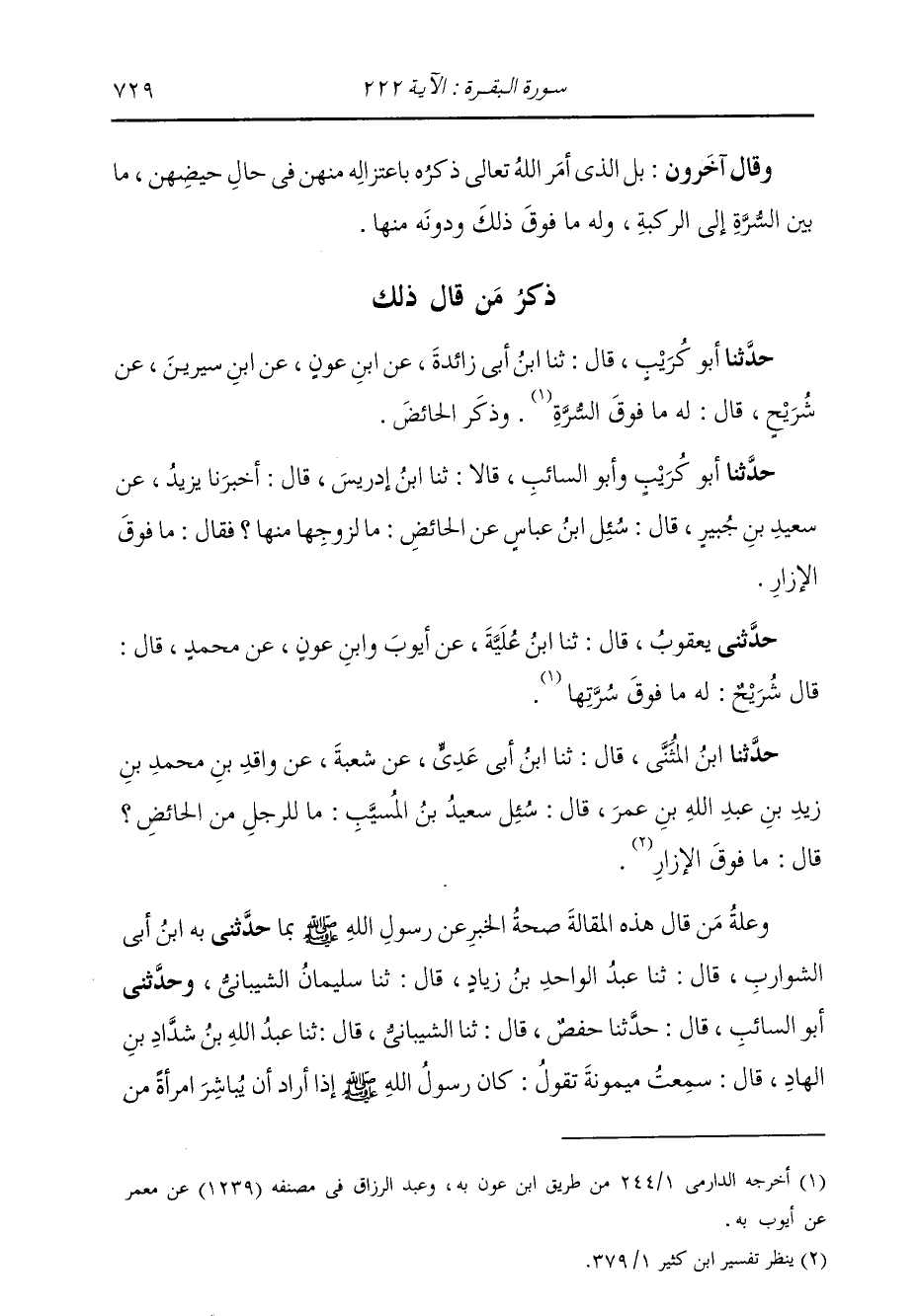 ذِكْرُ مَنْ قَالَ ذَلِكَ حَدَّثَنَا أَبُو كُرَيْبٍ، قَالَ: ثنا ابْنُ أَبِي زَائِدَةَ، عَنِ ابْنِ عَوْنٍ، عَنِ ابْنِ سِيرِينَ، عَنْ شُرَيْحٍ، قَالَ لَهُ: «§مَا فَوْقَ السُّرَّةِ، وَذَكَرَ الْحَائِضِ»