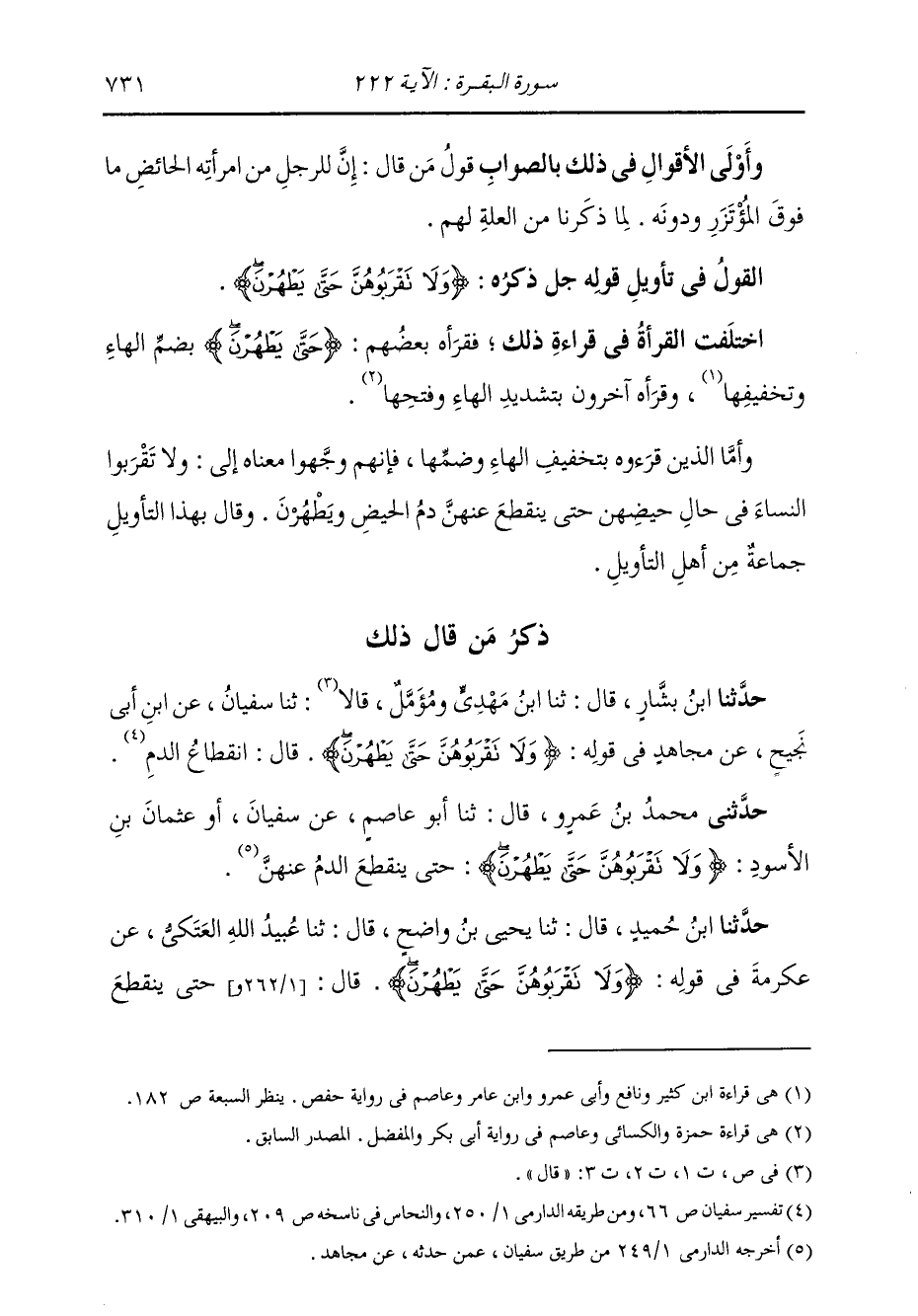 §الْقَوْلُ فِي تَأْوِيلِ قَوْلِهِ تَعَالَى: {وَلَا تَقْرَبُوهُنَّ حَتَّى يَطْهُرْنَ} [البقرة: 222] اخْتَلَفَ الْقُرَّاءُ فِي قِرَاءَةِ ذَلِكَ، فَقَرَأَهُ بَعْضُهُمْ: " {حَتَّى يَطْهُرْنَ} [البقرة: 222] " بِضَمِّ الْهَاءِ وَتَخْفِيفِهَا، وَقَرَأَهُ آخَرُونَ بِتَشْدِيدِ الْهَاءِ وَفَتْحِهَا. وَأَمَّا الَّذِينَ قَرَءُوهُ بِتَخْفِيفِ الْهَاءِ وَضَمِّهَا فَإِنَّهُمْ وَجَّهُوا مَعْنَاهُ إِلَى: وَلَا تَقْرَبُوا النِّسَاءَ فِي حَالِ حَيْضِهِنَّ حَتَّى يَنْقَطِعَ عَنْهُنَّ دَمُ الْحَيْضِ وَيَطْهُرْنَ. وَقَالَ بِهَذَا التَّأْوِيلِ جَمَاعَةٌ مِنْ أَهْلِ التَّأْوِيلِ